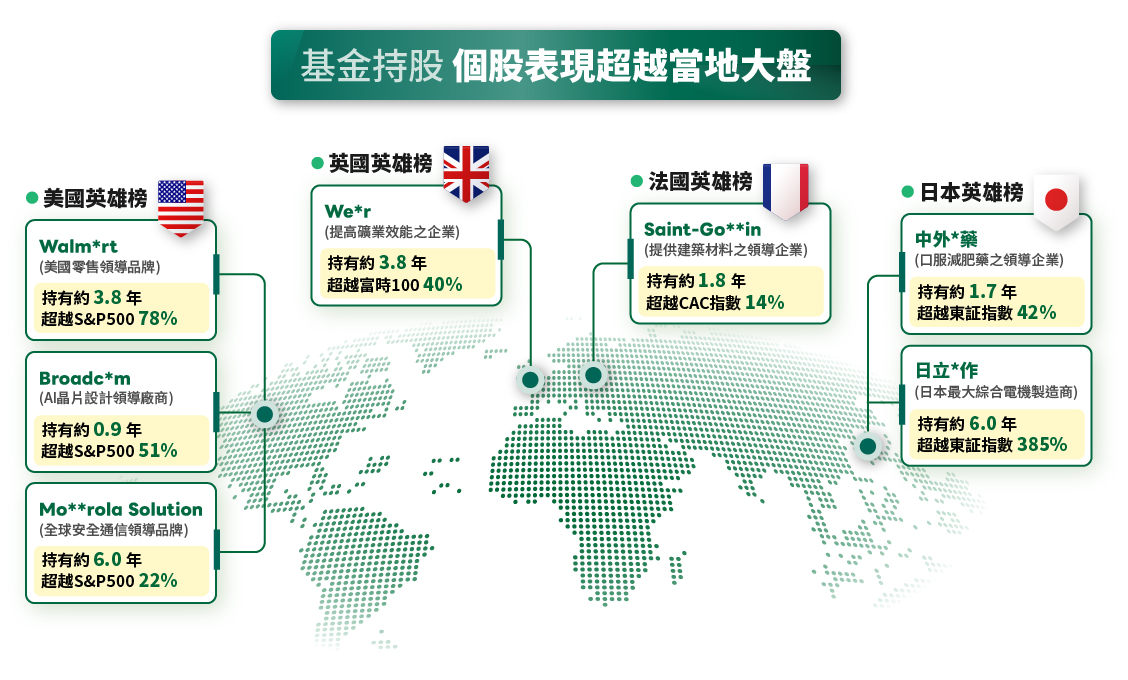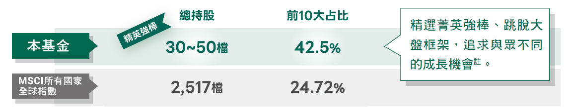 註:以2025/12/31為例,本基金持有之前10大持股企業,70%非參考指標之前10大持股,主動操作跳脫大盤、不從眾。基金配置會隨市況而變動,本公司不另行通知。圖文僅供參考,本公司無意藉此作任何徵求或推薦。申購本基金係持有基金受益憑證,而非本文提及之投資資產或標的。