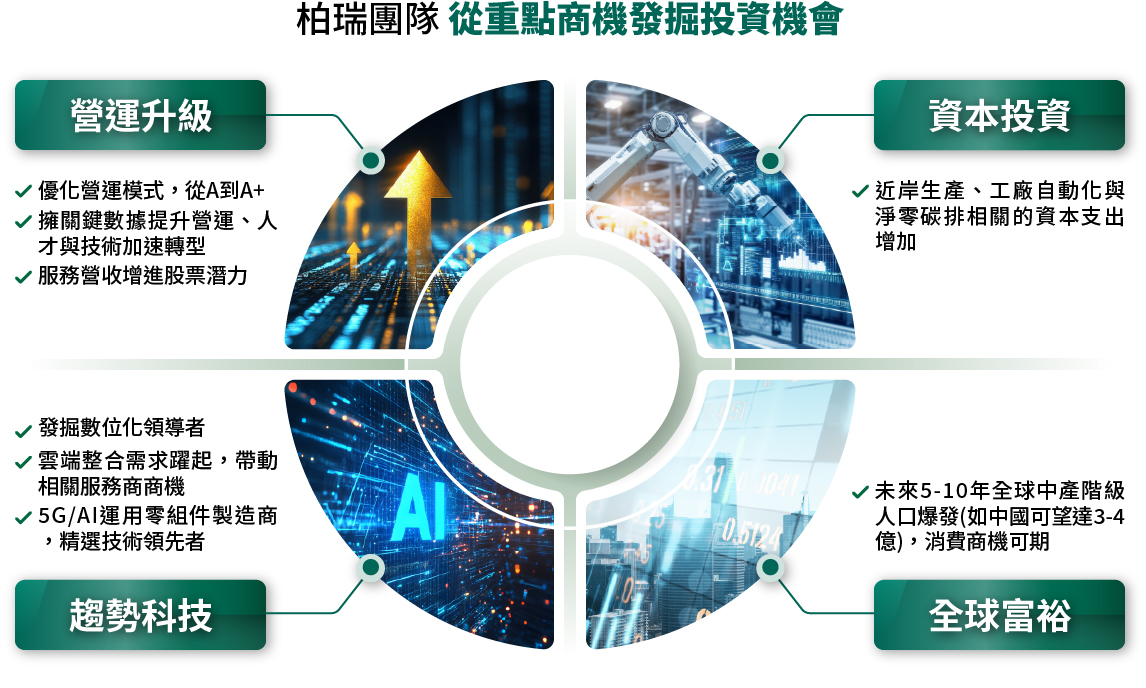 柏瑞投資團隊從「AI」概念的趨勢科技、資本投資到消費大潮,各方面挑選產業股票,深入發掘成長機會。