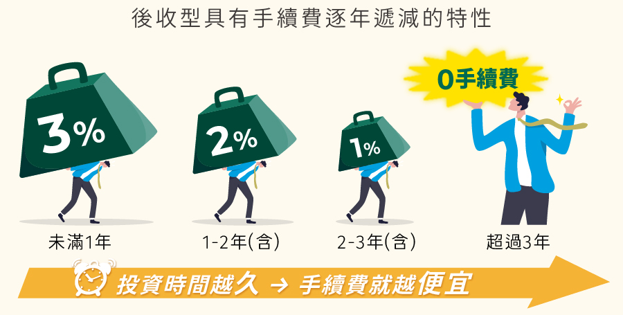後收級別基金於投資人申購時不收取手續費,於申請買回時才會依投資人持有期間收取遞延銷售手續費,若持有期間超過約定年限,則無須支付手續費。