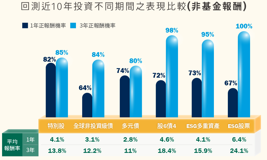 回測近10年的不同資產表現,投資3年的正報酬率比投資1年的正報酬率高,可見將投資期間拉長至3年以上,可拉高正報酬機會。別忘了投資N級別還能減少手續費、分銷費、轉換費等費用。