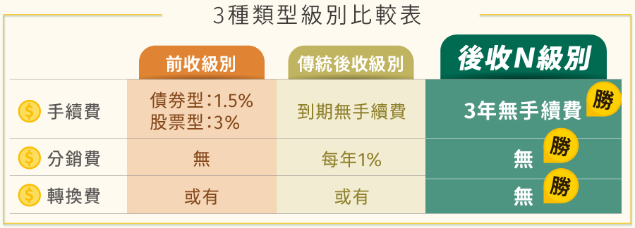 所謂的「N級別」即取「NEW」-為創新、首次的概念,該級別為境內多幣別、手續費後收型產品,一開始就不收分銷費,並在持有三年後就免手續費。傳統具有分銷費的後收型基金,報酬普遍落後於前收型基金,主因是持有愈久,累積收取的分銷費愈多(註1)。抽離分銷費後,才能使後收型與前收型能得到相同的報酬。