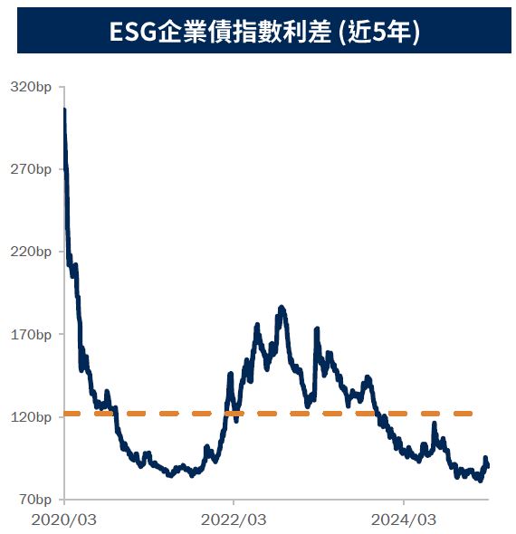 ESG企業債短期表現:近兩週美國10年期公債殖利率上升3.3個基點至4.3%,ESG企業債近2週上漲0.2%;利差低於5年均值(見下圖)。