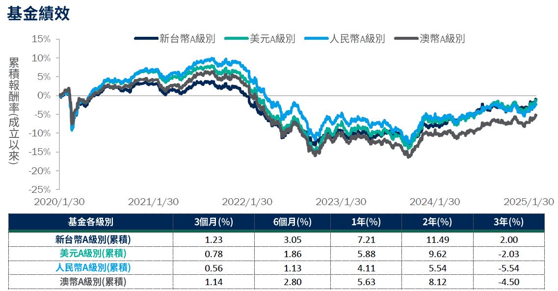 績效說明1:截至2月底,新台幣A級別(累積)績效為1年期7.21%、2年11.49%、3年2.00%。2025年迄今正貢獻來源:利息收入、債券價格及利率期貨;負貢獻來源:匯率與其他(含費用)。