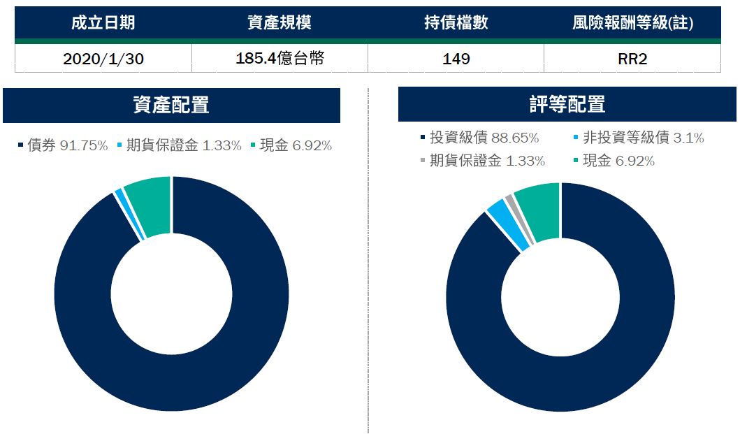 資料來源:柏瑞投信,2025/3/21。現金部位中可能含期貨保證金及國庫券。配置會隨市況而改變,本公司不另行通知。非投資等級債仍有相關風險。基金雖有避險策略,但不代表能完全規避此類匯價波動的風險,避險策略將視市況有所調整。投資人應留意衍生性工具/證券相關商品等槓桿投資策略所可能產生之投資風險,詳見公開說明書。(註):本基金主要投資於全球之投資等級債券,雖以兼顧信用評等優質債券投資機會與ESG投資目標,惟風險無法因分散投資而完全消除,遇相關風險時對基金淨資產價值可能產生較大波動,經計算本基金過去5年淨值波動度(成立未滿5年者,另參考成立以來淨值波動度至內部檢視日),並與同類型基金過去5年淨值波動度及波動度內部參考指數之過去5年波動度相較,爰參酌投信投顧公會「基金風險報酬等級分類標準」,本基金風險報酬等級屬RR2。風險報酬等級為本公司依照投信投顧公會「基金風險報酬等級分類標準」編製,該分類標準係計算過去5年基金淨值波動度標準差,以標準差區間予以分類等級,分類為RR1-RR5五級,數字越大代表風險越高。此等級分類係基於一般市場狀況反映市場價格波動風險,無法涵蓋所有風險(如:基金計價幣別匯率風險、投資標的產業風險、信用風險、利率風險、流動性風險等),不宜作為投資唯一依據,投資人仍應注意所投資基金個別的風險。請投資人注意申購基金前應詳閱公開說明書,充分評估基金投資特性與風險,更多基金評估之相關資料(如年化標準差、Alpha、Beta及Sharpe值等)可至投信投顧公會網站之「基金績效及評估指標查詢專區」(https://www.sitca.org.tw/index_pc.aspx )查詢。投資人申購本基金係持有基金受益憑證,而非本文提及之投資資產或標的。