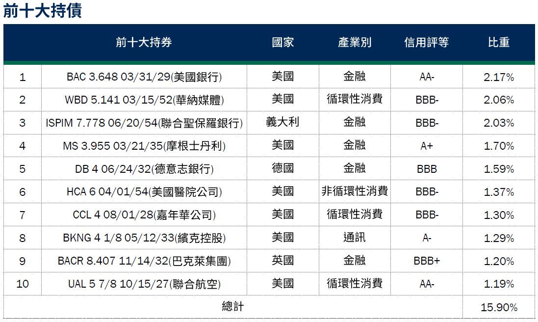 1. 資料來源:Lipper、柏瑞投信,2025/2/28。2. 柏瑞投信,2025/2/28。平均殖利率係假設基金投資組合中各債券持有至到期所獲得的收益,包括各期利息收入的再投資。相當於按當前(計算日)市場價格購買並且一直持有到滿期時可獲得的年均報酬率。基金平均殖利率會隨著個別債券價格或票息等因素變動,不代表基金實質報酬率及未來走勢。圖文僅供參考,本文提及之企業,本公司無意藉此作任何徵求或推薦。非投資等級債仍有相關風險。過去績效不代表未來收益之保證。投資人申購本基金係持有基金受益憑證,而非本文提及之投資資產或標的。投資人應留意衍生性工具/證券相關商品等槓桿投資策略所可能產生之投資風險,詳見公開說明書。