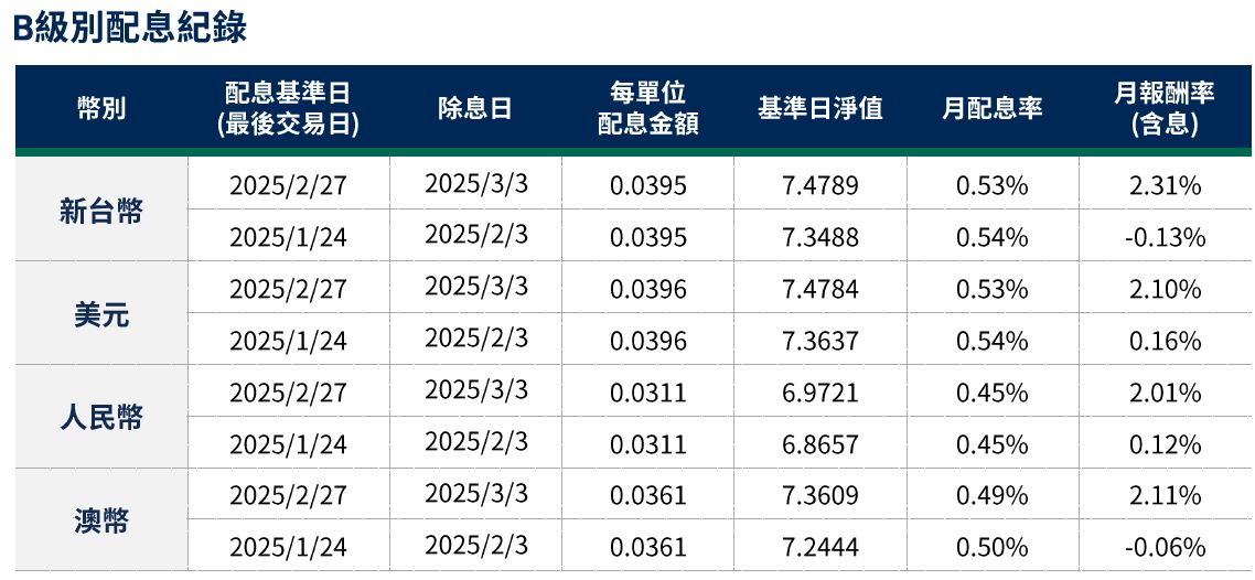 月配息率=(每單位配息金額÷除息日前一日淨值)×100%。月報酬率(含息)=(月底淨值-上月底淨值+上月配息金額)÷上月底淨值。舉凡成立第一個月配息者,該次「月報酬率」欄係指成立日至該月底之報酬率。資料來源:柏瑞投信,2025/3。新台幣/美元/人民幣/澳幣計價。基金配息不代表基金實際報酬,且過去配息不代表未來配息;基金淨值可能因市場因素而上下波動。積極配息的基金未必適合投資人,請投資前審慎評估。配息政策請詳閱各基金公開說明書;配息組成項目請至公司網站查詢。基金的配息可能由基金的收益或本金支付。任何涉及由本金支出的部分,可能導致原始投資金額減損。基金進行配息前未先扣除應負擔之相關費用。