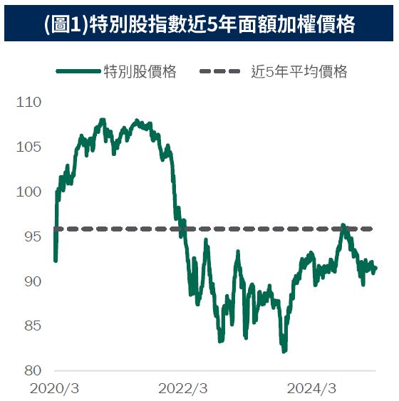 特別股短期表現:近兩週美國10年期公債殖利率上升3.3個基點至4.31%,特別股受利差收斂影響指數近2週上漲0.93%,相比5年均值96相對折價。