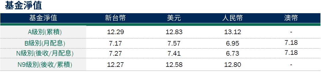 投組概況:截至2025/3/21,本基金投資組合的殖利率*(詳見第3頁註釋)約6.78%,現金部位1.61%;台幣級別避險比例32.78%,人民幣級別避險比例81.74%,澳幣級別避險比例86.66%,日幣級別避險比例14.83%(因新資金申購導致避險比率下降,截至2025/3/24已提升至40%目標避險比例)。