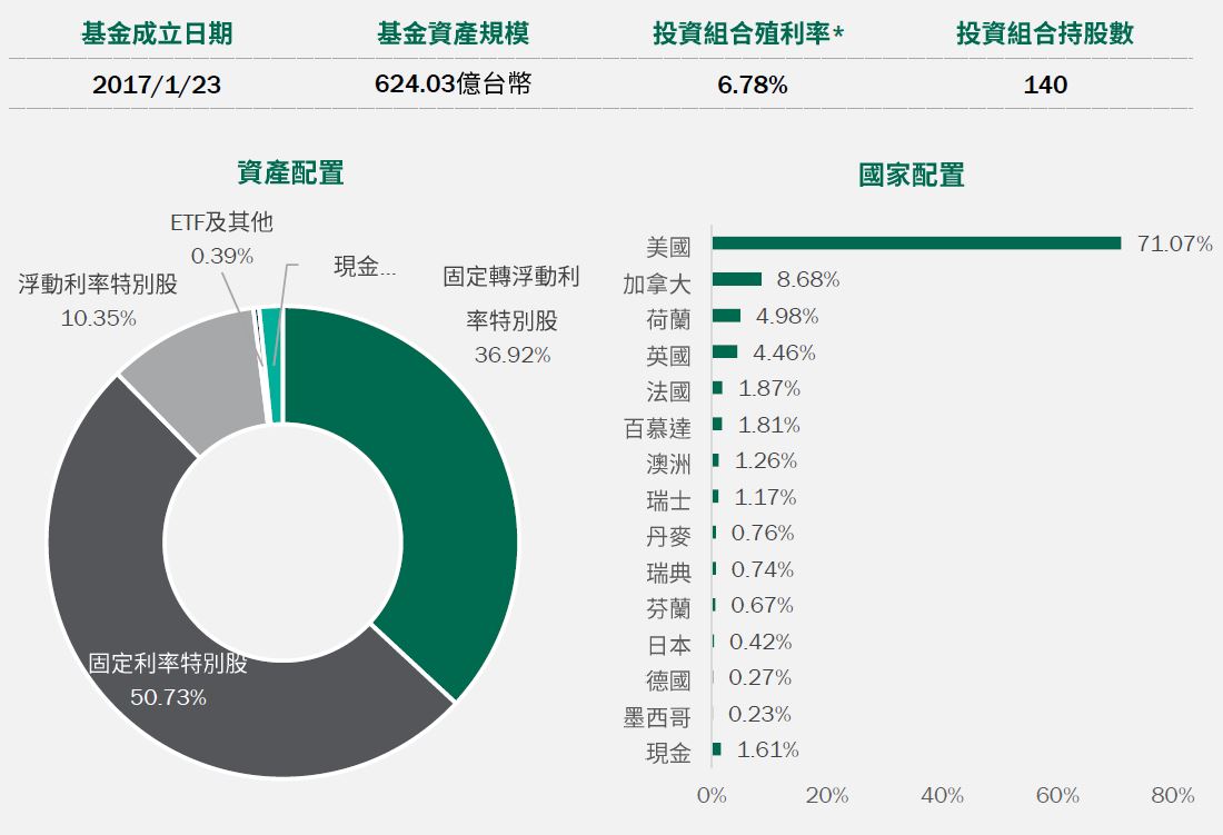資產配置:基金整體策略仍以布局高票息、基本面穩健等中長期投資價值較優的特別股,以及伺機參與新發行特別股的投資機會,並同時兼顧利率與信用等風險控管,目前亦未投資與普通股連動程度較高的可轉換特別股,避免承受額外的市場波動風險。
