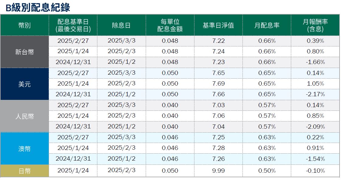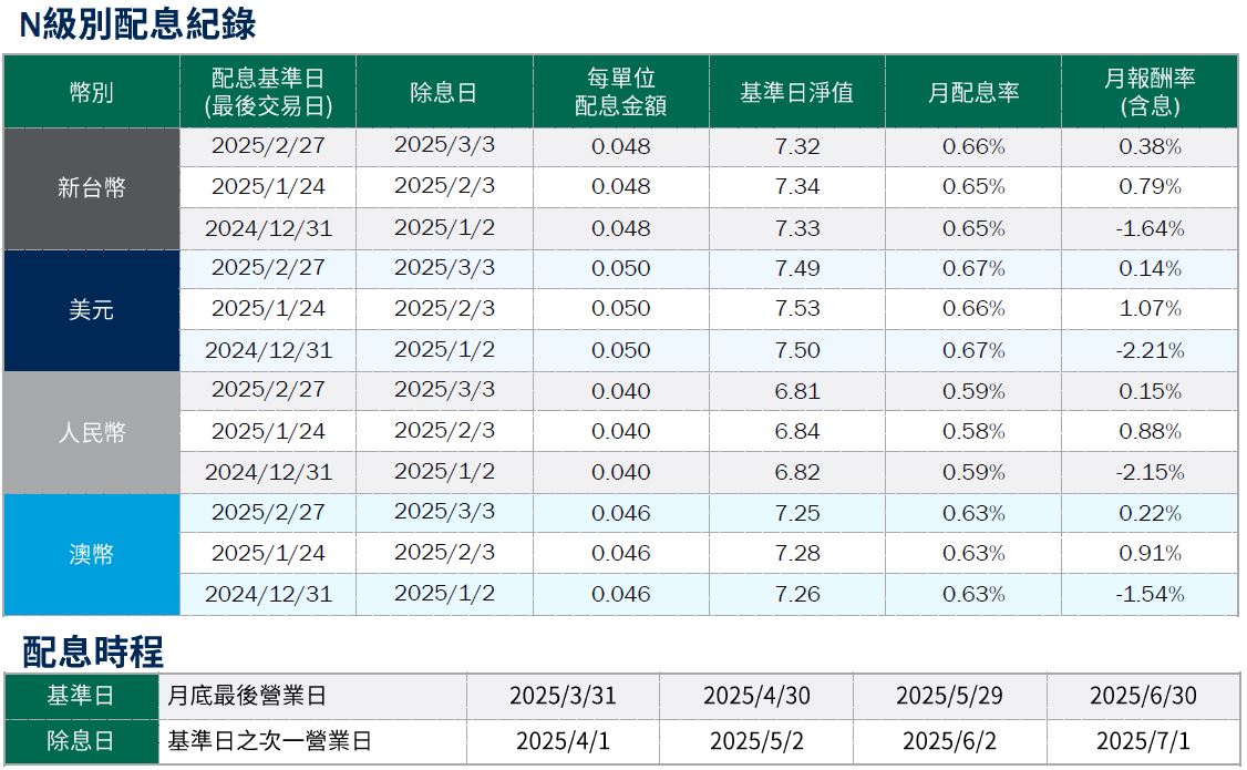 月配息率=(每單位配息金額÷除息日前一日淨值)×100%。 月報酬率(含息)=(月底淨值-上月底淨值+上月配息金額)÷上月底淨值。資料來源:柏瑞投信,2025/3。新台幣/美元/人民幣/澳幣/日幣計價。基金配息不代表基金實際報酬,且過去配息不代表未來配息;基金淨值可能因市場因素而上下波動。積極配息的基金未必適合投資人,請投資前審慎評估。配息政策請詳閱各基金公開說明書;配息組成項目請至公司網站查詢。基金的配息可能由基金的收益或本金支付。任何涉及由本金支出的部分,可能導致原始投資金額減損。基金進行配息前未先扣除應負擔之相關費用。