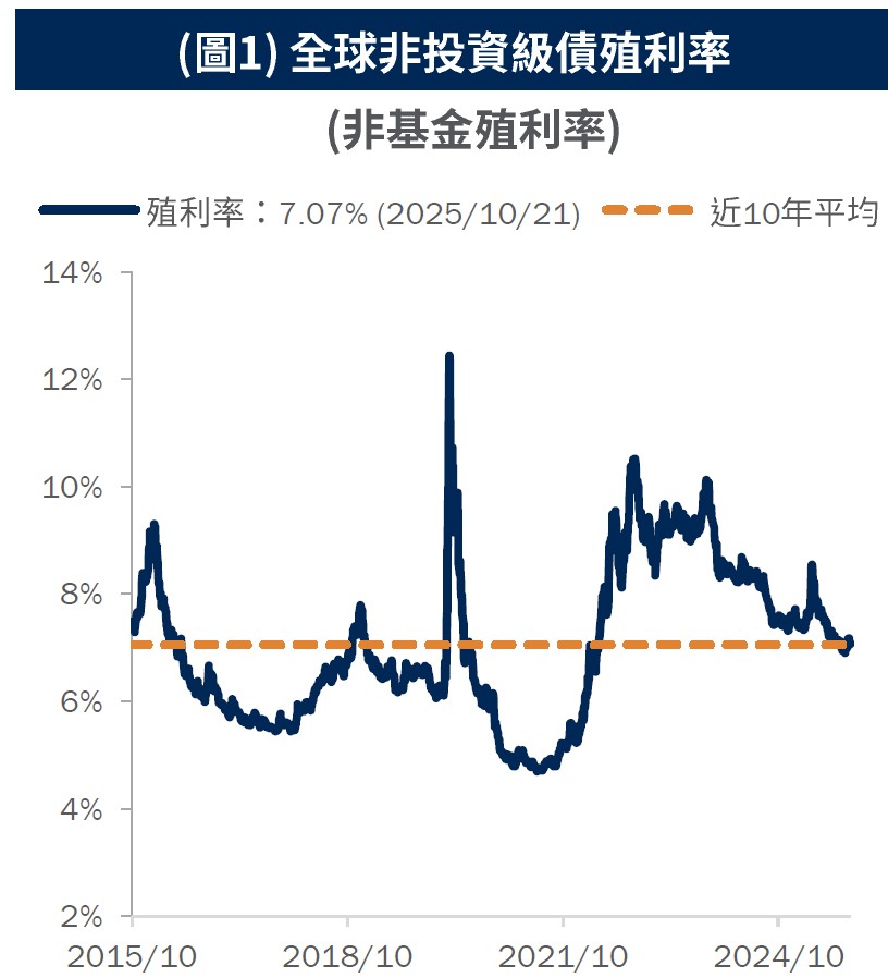 資料來源:Bloomberg,2025/10/21。指數採彭博全球非投資等級債券指數。殖利率不代表報酬率。非投資等級債券仍有相關風險,請投資前審慎評估風險承受度。