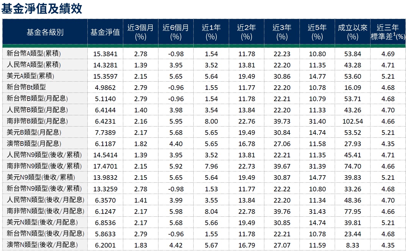 避險比率:新台幣級別避險比例為45.26%,人民幣級別避險比例82.75%,澳幣級別避險比例83.96%,南非幣級別避險比例83.39%。