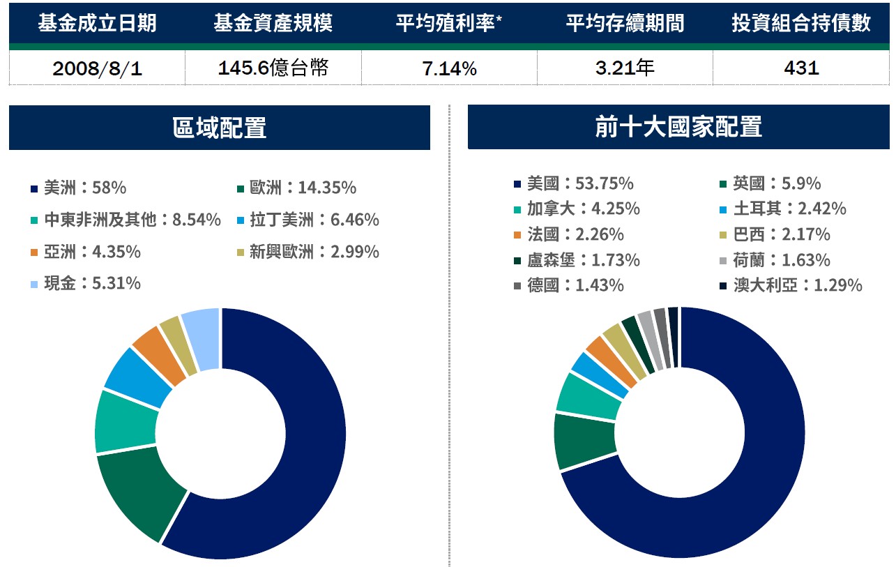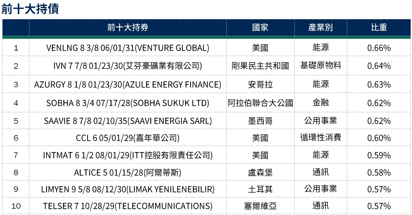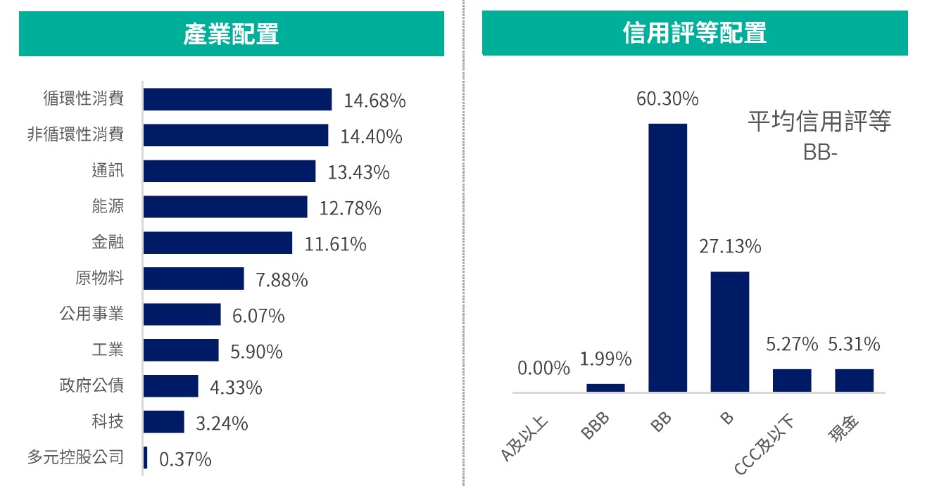 資料來源:柏瑞投信,2025/9/30。配置會隨市況而改變,本公司不另行通知。非投資等級債券仍有相關風險,請投資前審慎評估風險承受度。*平均殖利率係假設基金投資組合中各債券持有至到期所獲得的收益,包括各期利息收入的再投資。相當於按當前(計算日)市場價格購買並且一直持有到滿期時可獲得的年均報酬率。基金平均殖利率會隨著個別債券價格或票息等因素變動,不代表基金實質報酬率及未來走勢。本基金之投資組合平均信評計算方式:若同一標的有多家信評公司給予不同信評時,按高低順序取最高信評。將個別債券按上述方式定義之信評等級,參酌其相對應之評分(例如:AAA為1分、AA+為2分,依此類推),並依標的市值佔淨資產價值之比重(包含現金),加權平均後無條件捨去,以此數值結果對應信評評分等級,及自投資組合確立後依投資標的信評揭示相關比重。投資人申購本基金係持有基金受益憑證,而非本文提及之投資資產或標的。