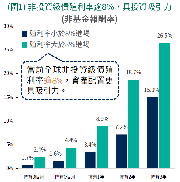 •全球非投資級債券殖利率水準逾8%(截至2024年3月底)且高於近5年均值,回顧過往於殖利率8%以上進行資產布局,往後多有正報酬表現 (圖1)。