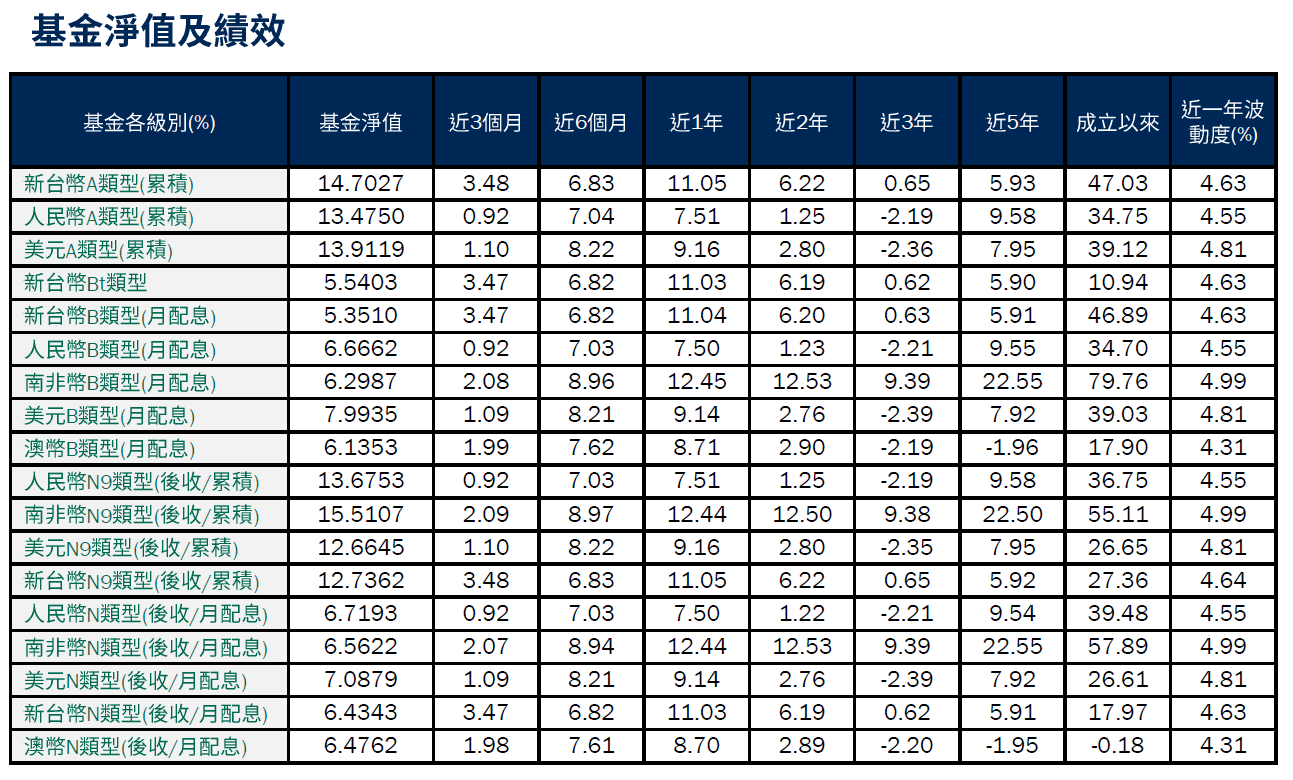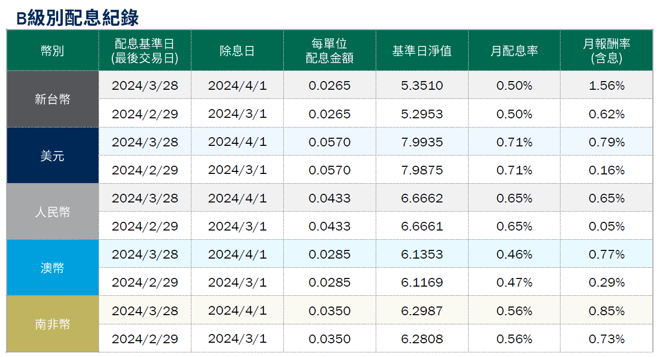 •避險比例(截至3月31日):新台幣級別避險比例為34.21%,人民幣級別避險比例84.85%,澳幣級別避險比例80.21%,南非幣級別避險比例88.83%