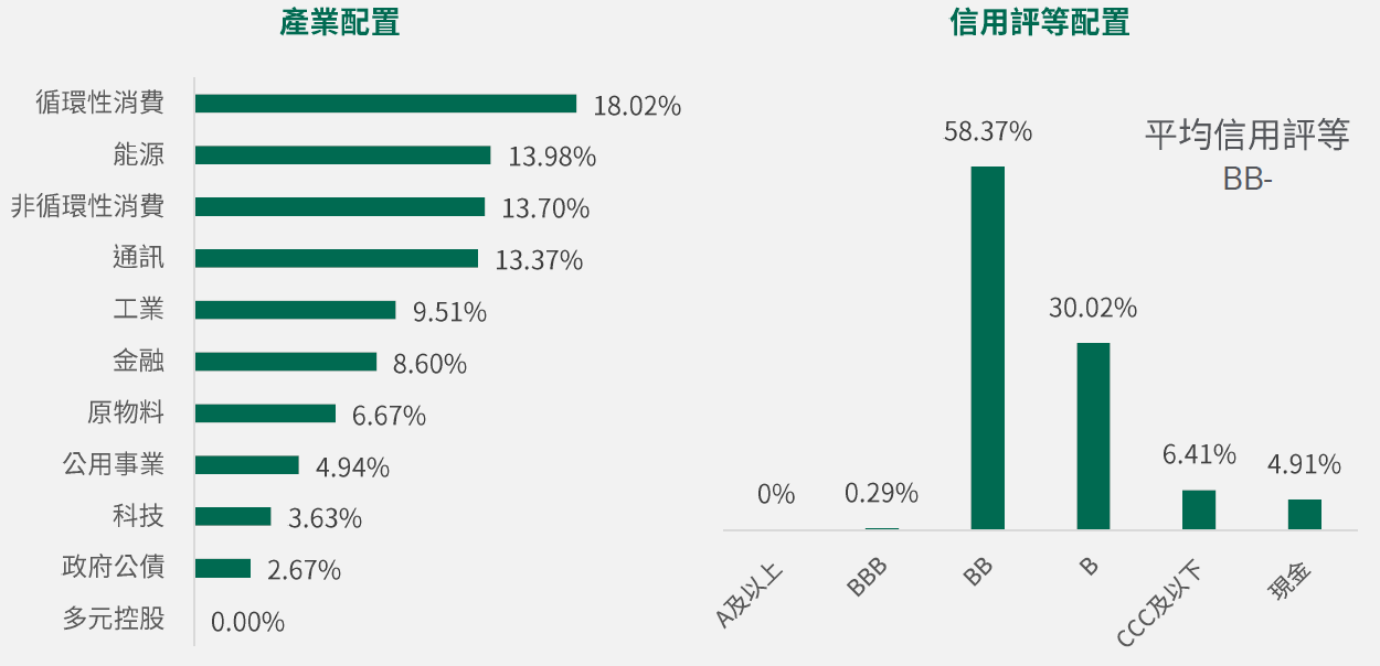資料來源:柏瑞投信,2024/3/31。配置會隨市況而改變,本公司不另行通知。非投資等級債券仍有相關風險,請投資前審慎評估風險承受度。*平均殖利率係假設基金投資組合中各債券持有至到期所獲得的收益,包括各期利息收入的再投資。相當於按當前(計算日)市場價格購買並且一直持有到滿期時可獲得的年均報酬率。基金平均殖利率會隨著個別債券價格或票息等因素變動,不代表基金實質報酬率及未來走勢。本基金之投資組合平均信評計算方式:若同一標的有多家信評公司給予不同信評時,按高低順序取最高信評。將個別債券按上述方式定義之信評等級,參酌其相對應之評分(例如:AAA為1分、AA+為2分,依此類推),並依標的市值佔淨資產價值之比重(包含現金),加權平均後無條件捨去,以此數值結果對應信評評分等級,及自投資組合確立後依投資標的信評揭示相關比重。投資人申購本基金係持有基金受益憑證,而非本文提及之投資資產或標的。