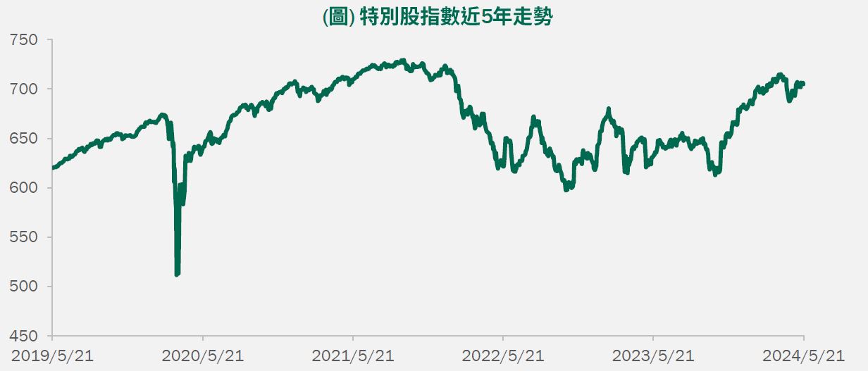 美國4月份通膨數據降溫,其中聯準會關注的核心通膨年增率下降至3.6%,創下近3年以來新低。此外,聯準會主席鮑爾在談話中指出就當前的數據而言,聯準會下一步行動為升息的機率不大,降低市場對於聯準會再度升息的擔憂。隨通膨數據降溫及聯準會升息的疑慮消彌,市場對於利率前景轉為樂觀,帶動美國公債殖利率緩步下行,固定收益資產短期亦獲得較佳的成長動能。美國股市近期除受惠於降息預期改善之外,亦受惠於企業財報的激勵效果。截至5/19日,美國標普500指數約9成企業已公布第一季財報,EPS年增率達到4%,且有約8成企業EPS優於市場預期,獲利表現升溫驅動股價續攻歷史高點。近期主要成熟國家的經濟數據則略有分歧,歐元區第一季GDP翻正,雖最大經濟體德國GDP季減0.2%,但法國GDP季增1.1%推升歐元區經濟成長;日本第一季GDP則陷入萎縮格局,其中個人消費項目季減0.7%,反映在日圓續貶的環境壓抑日常消費表現。總的來說,當前美國利率前景正趨於樂觀,且企業獲利增速逐漸升溫,有望帶動股債市資產短期表現,惟須關注因利率維持高位對於家庭支出造成的壓力。美國10年期公債殖利率近2週下行約4.5個基點至4.412%,惟特別股指數微幅下跌0.19%(見下圖),目前指數面額加權價格為91.3,相比近5年均值的97.9仍相對折價。