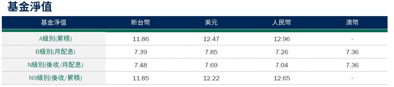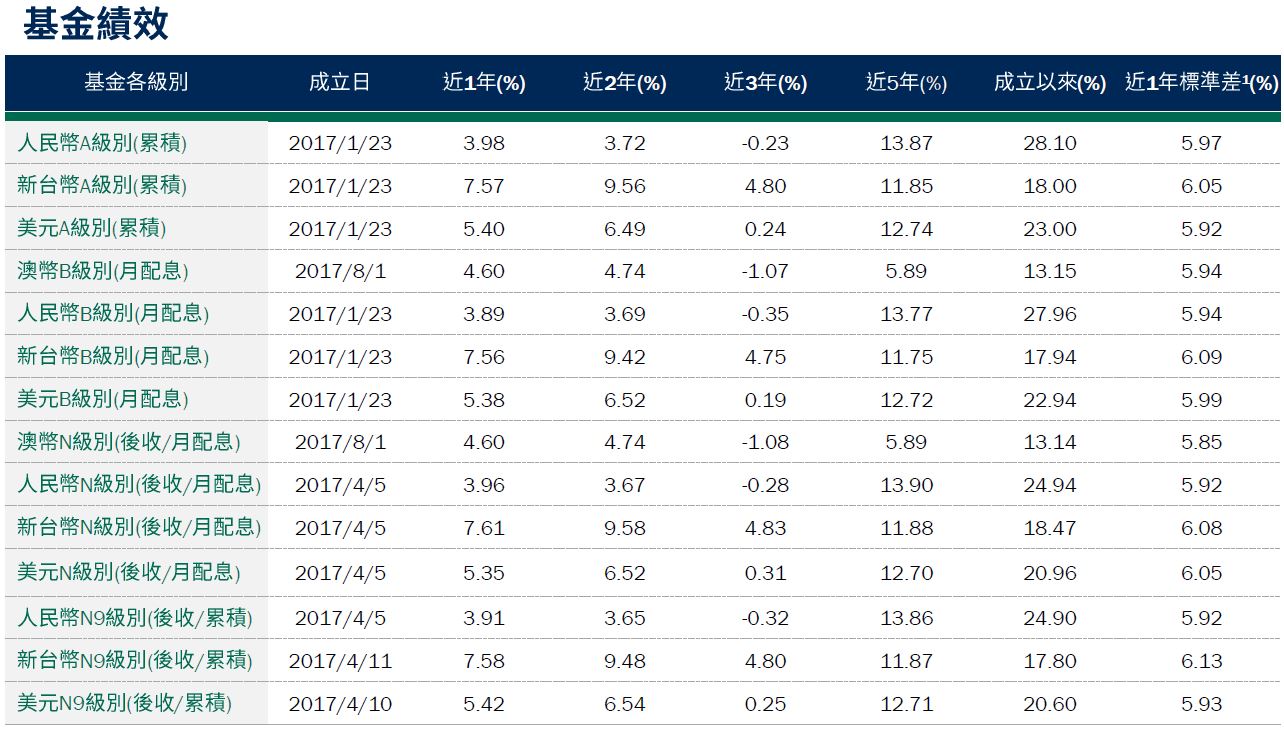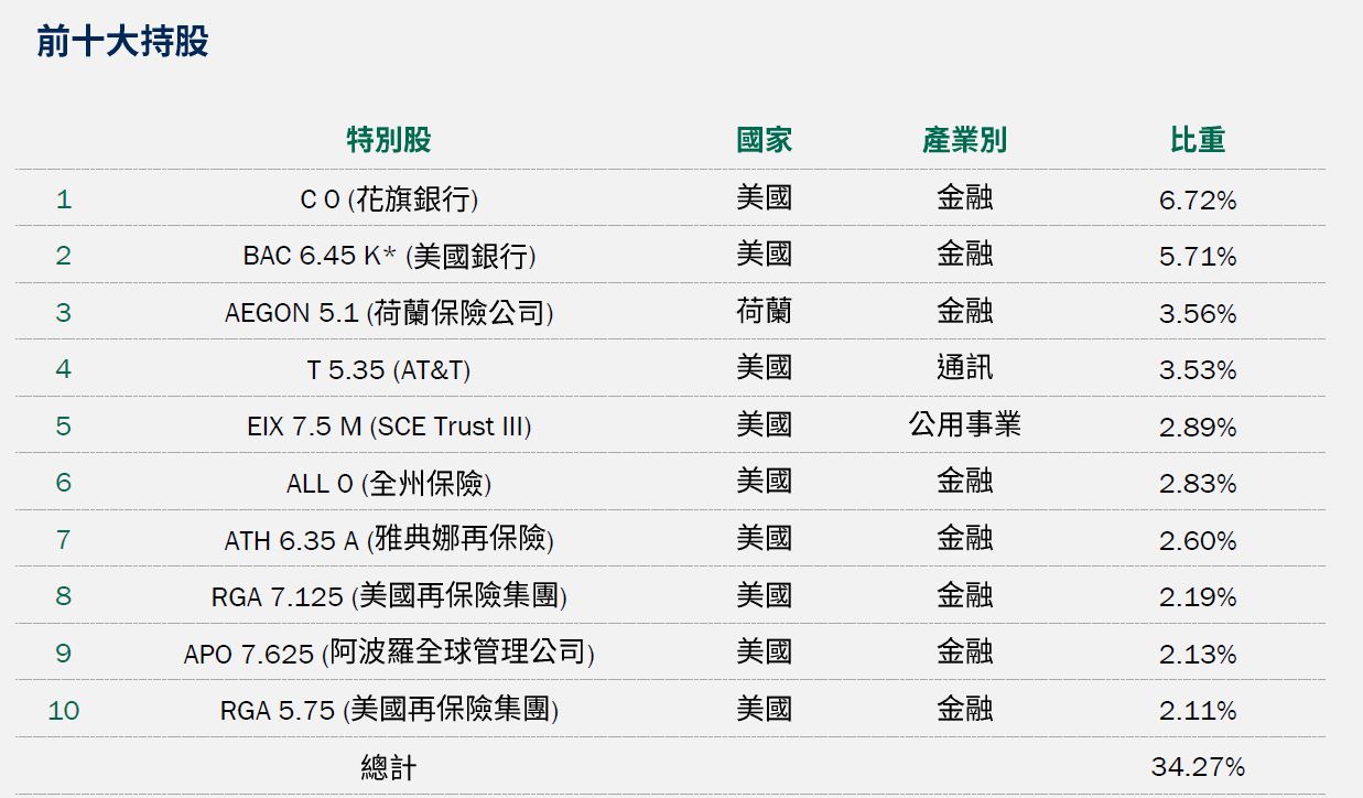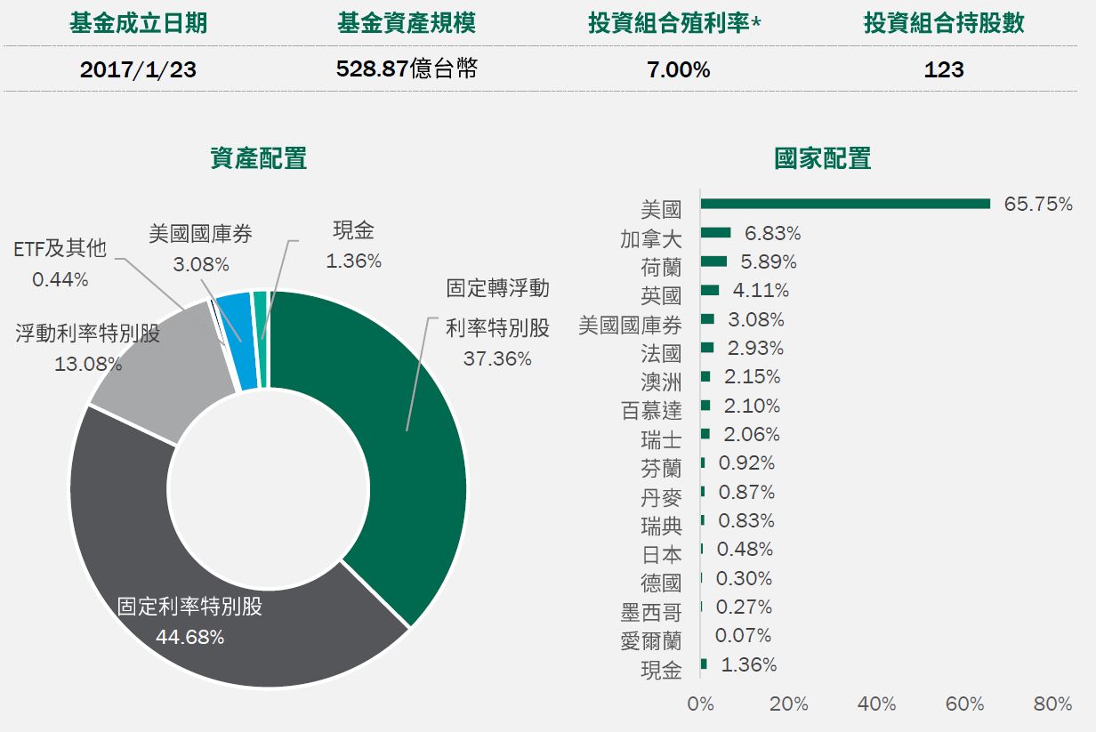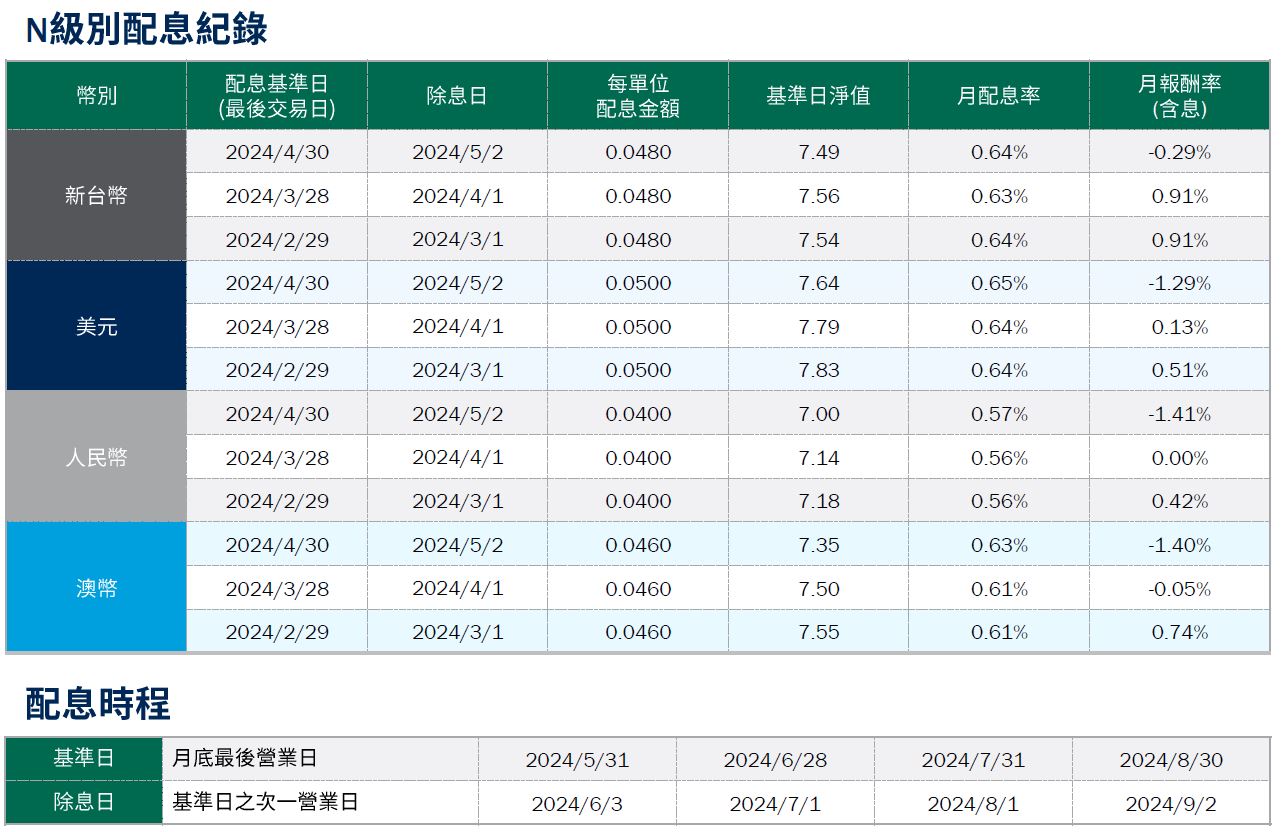 基金整體策略仍以布局高票息、基本面穩健等中長期投資價值較優的特別股,以及伺機參與新發行特別股的投資機會,並同時兼顧利率與信用等風險控管,目前亦未投資與普通股連動程度較高的可轉換特別股,避免承受額外的市場波動風險,持續為投資人建立中長期風險調整後報酬潛力較好的投資組合。截至2024/5/17,本基金投資組合的殖利率*(詳見第3頁註釋)約7.00%,現金部位1.36%;台幣級別避險比例31.79%,人民幣級別避險比例76.79%,澳幣級別避險比例78.10%。