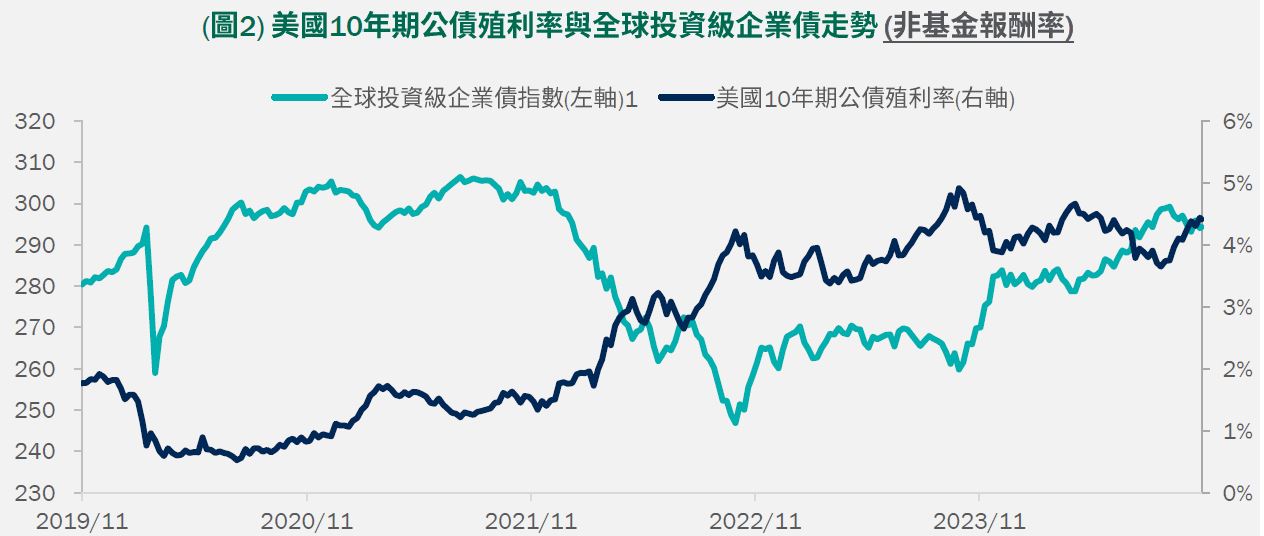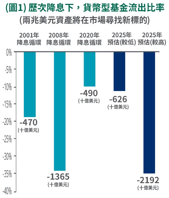•雖市場近期下修聯準會降息,惟降息仍是2025年主要政策方向。隨著基準利率走降,貨幣型基金有望出現一定程度的外流(圖1),以尋求更具吸引力的金融資產。當前多數固定收益資產殖利率位於近年相對高點,後續有望獲得資金的青睞。