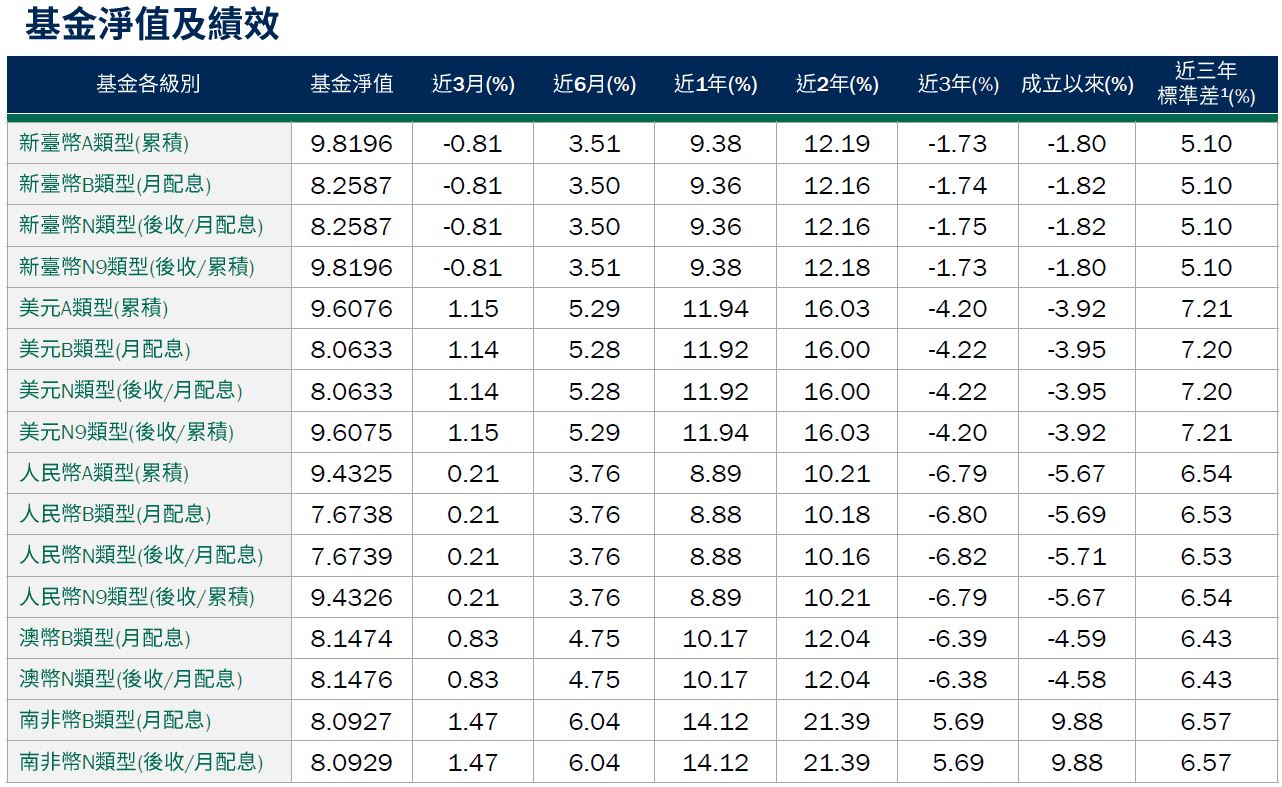•避險比例(基金級別):截至10月31日,基金台幣級別避險比例為34.62%,人民幣級別避險比例90.23%,澳幣級別避險比例95.20%,南非幣級別避險比例93.37%