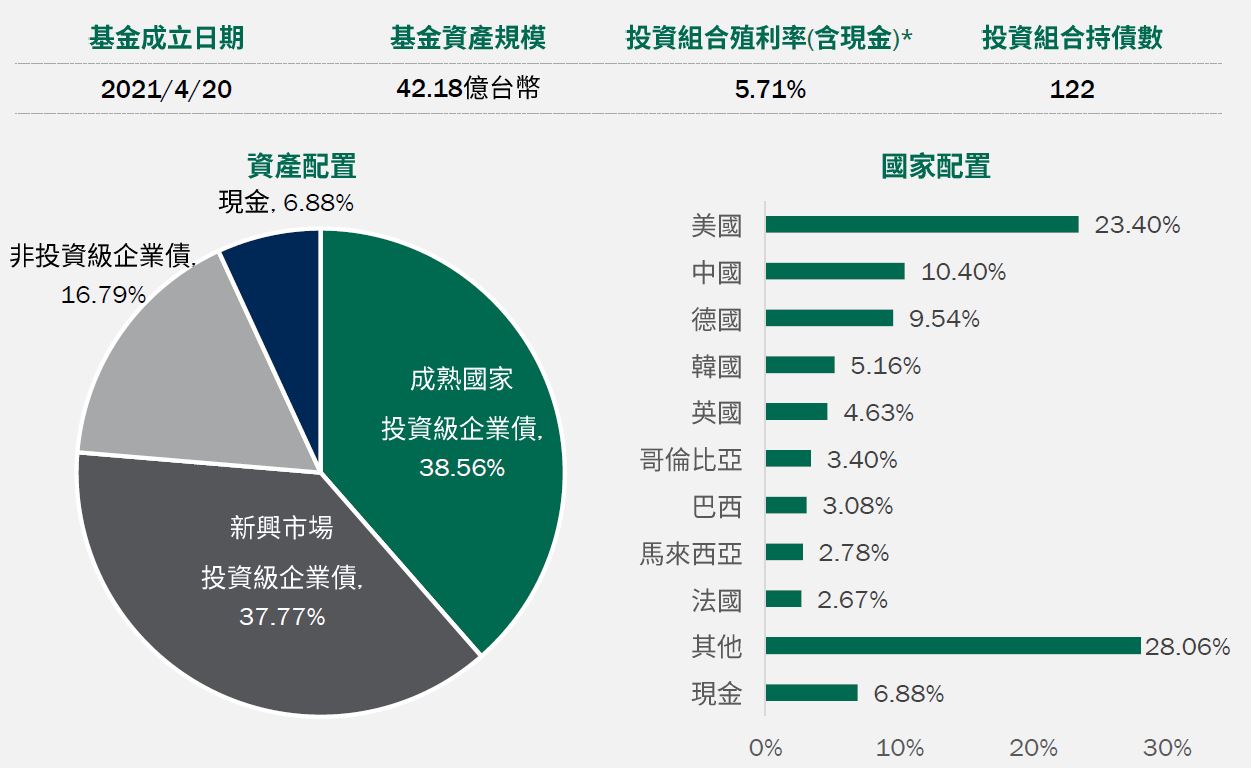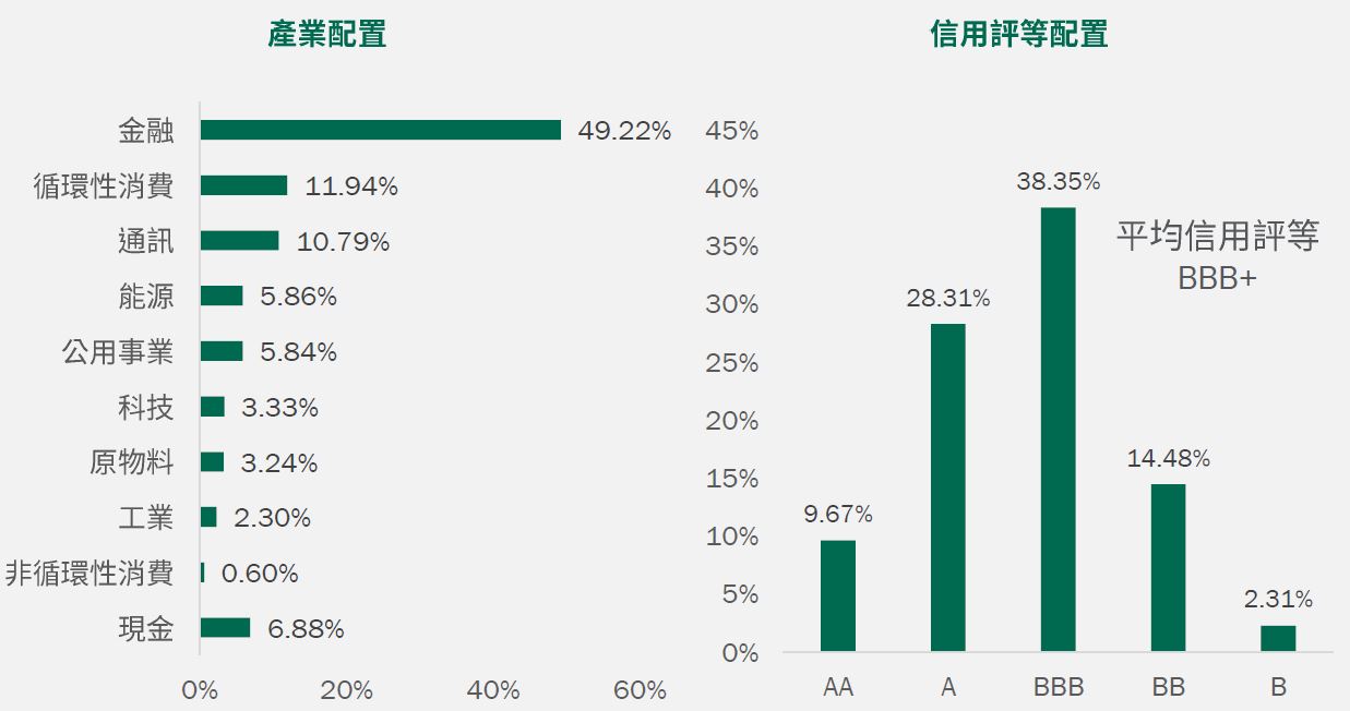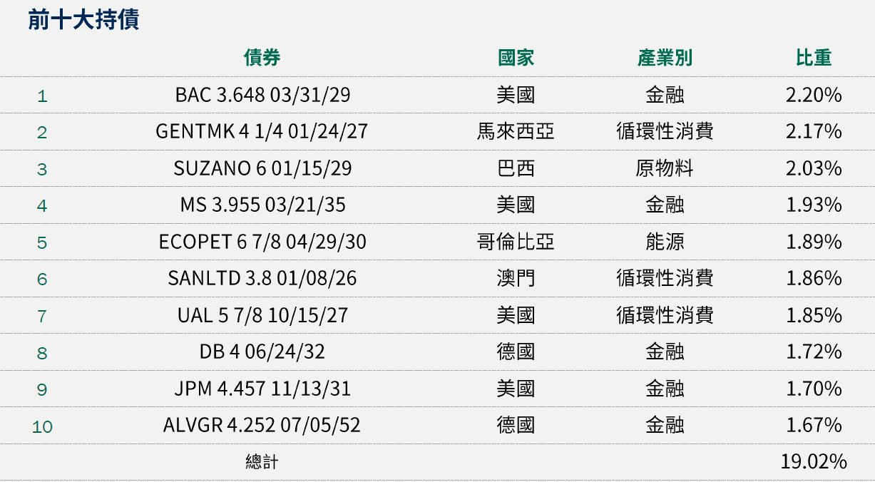 資料來源:柏瑞投信,2024/10/31。配置會隨市況而改變,本公司不另行通知。非投資等級債券仍有相關風險,請投資前審慎評估風險承受度。*註:投資組合殖利率採當期殖利率(Current Yield),計算方式為加權平均特別股及債券的票息除以價格;ETF及REIT則使用12個月股利率。因小數點後位數四捨五入之故,總和可能不完全等於100.0%。基金殖利率會隨著個別債券價格或票息等因素變動,不代表基金實質報酬率及未來走勢。本基金之投資組合平均信評計算方式:若同一標的有多家信評公司給予不同信評時,按高低順序取最高信評。將個別債券按上述方式定義之信評等級,參酌其相對應之評分(例如:AAA為1分、AA+為2分,依此類推),並依標的市值佔淨資產價值之比重(包含現金),加權平均後無條件捨去,以此數值結果對應信評評分等級,及自投資組合確立後依投資標的信評揭示相關比重。投資人申購本基金係持有基金受益憑證,而非本文提及之投資資產或標的。