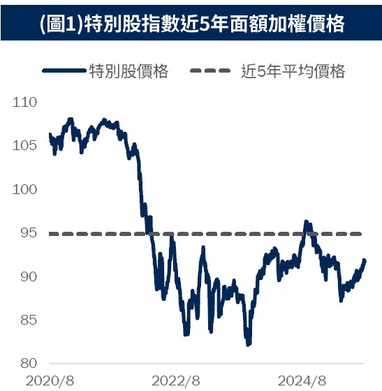 特別股指數表現:近兩週美國10年期公債殖利率下行3個基點至4.26%,特別股指數上漲0.99%,面額價格相比5年均值相對折價(圖1)。
