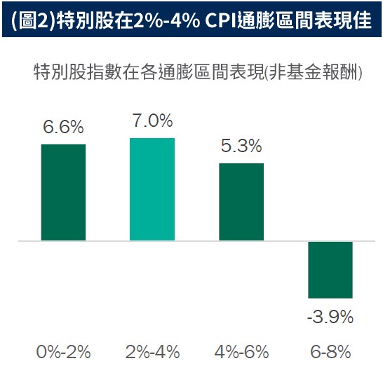 特別股在2%-4%通膨區間表現佳:市場擔憂第三季關稅可能推升通膨,然而歷史經驗顯示,當通膨維持在2%-4%的區間時,特別股表現往往最為穩健(圖2)。主要受惠其較高之收益能有效抵禦通膨影響,另外固定配發股息的特性在利率高位回落前則更具吸引力。