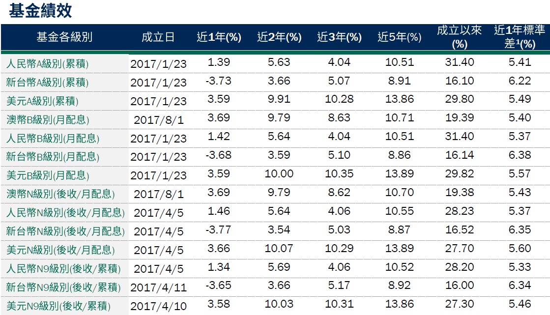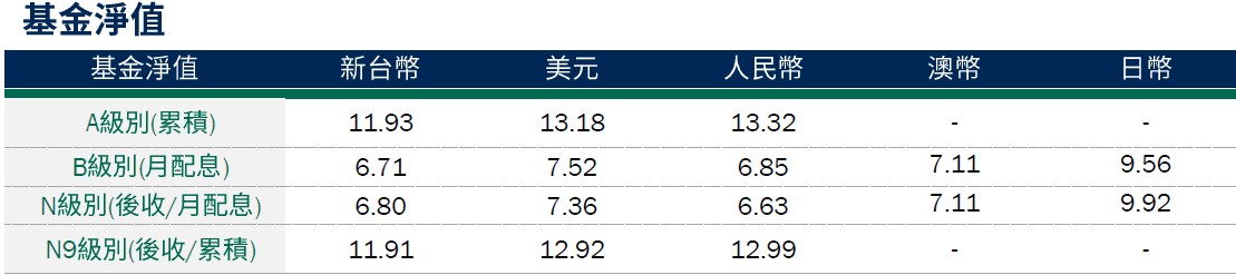 投組概況:截至2025/8/22,本基金投資組合的殖利率*(詳見第3頁註釋)約6.68%,現金部位1.05%;台幣級別避險比例43.37%,人民幣級別避險比例86.01%,澳幣級別避險比例88.13%,日幣級別避險比例41.02%。