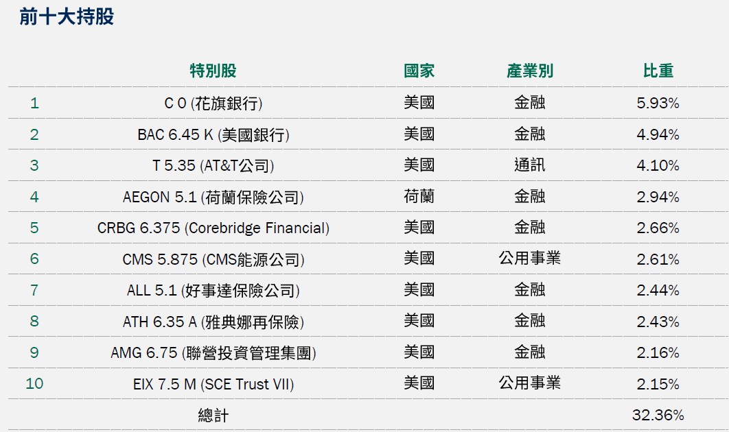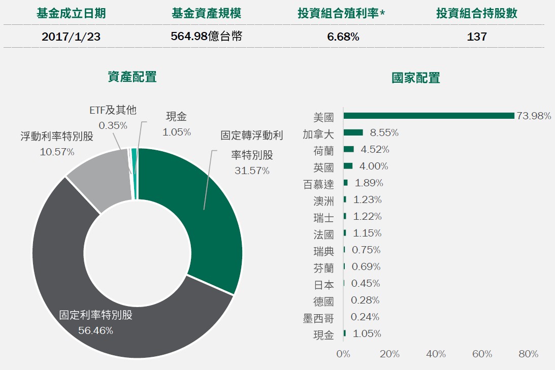 資產配置:基金整體策略仍以布局高票息、基本面穩健等中長期投資價值較優的特別股,以及伺機參與新發行特別股的投資機會,並同時兼顧利率與信用等風險控管,目前亦未投資與普通股連動程度較高的可轉換特別股,避免承受額外的市場波動風險。
