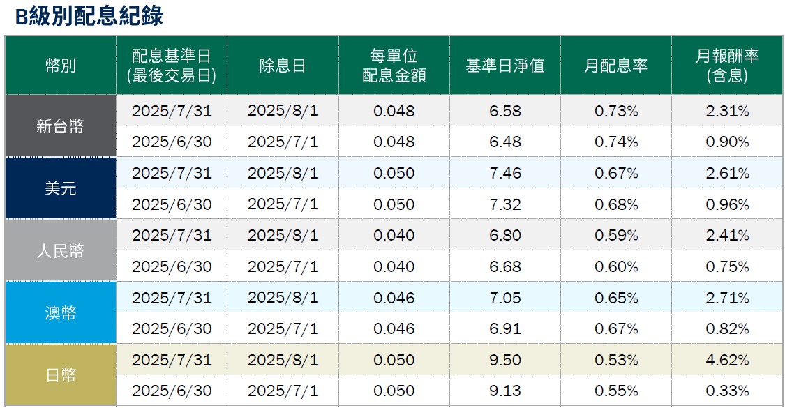 月配息率=(每單位配息金額÷除息日前一日淨值)×100%。 月報酬率(含息)=(月底淨值-上月底淨值+上月配息金額)÷上月底淨值。資料來源:柏瑞投信,2025/8。新台幣/美元/人民幣/澳幣/日幣計價。基金配息不代表基金實際報酬,且過去配息不代表未來配息;基金淨值可能因市場因素而上下波動。積極配息的基金未必適合投資人,請投資前審慎評估。配息政策請詳閱各基金公開說明書;配息組成項目請至公司網站查詢。基金的配息可能由基金的收益或本金支付。任何涉及由本金支出的部分,可能導致原始投資金額減損。基金進行配息前未先扣除應負擔之相關費用。