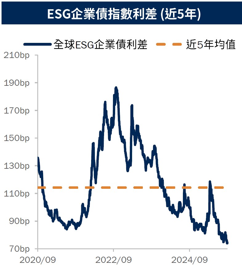 ESG企業債短期表現:近兩週美國10年期公債殖利率上行2個基點至4.11%,惟ESG企業債近2週上漲0.24%;利差低於5年均值(見左圖)。