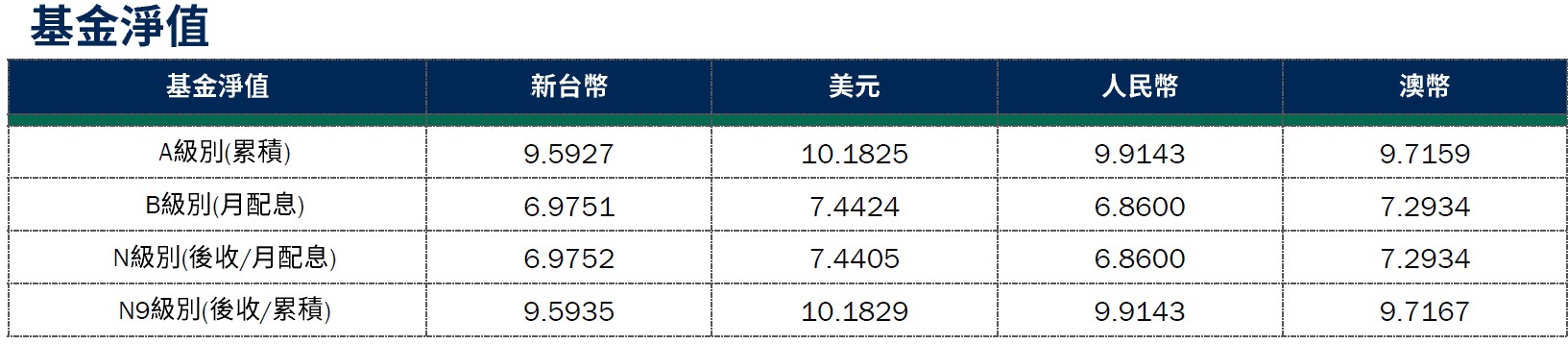 後市展望:美國7月就業報告意外疲弱與聯準會鷹派理事離職,強化市場對於9月降息期待,而聯準會主席於月底的全球央行年會首度暗示9月貨幣政策利率有調整可能,進一步帶動美國短年期公債利率大幅下滑。基金將在波動中適度調整存續期間配置,以期在各區域/國家輪動中掌握投資機會。