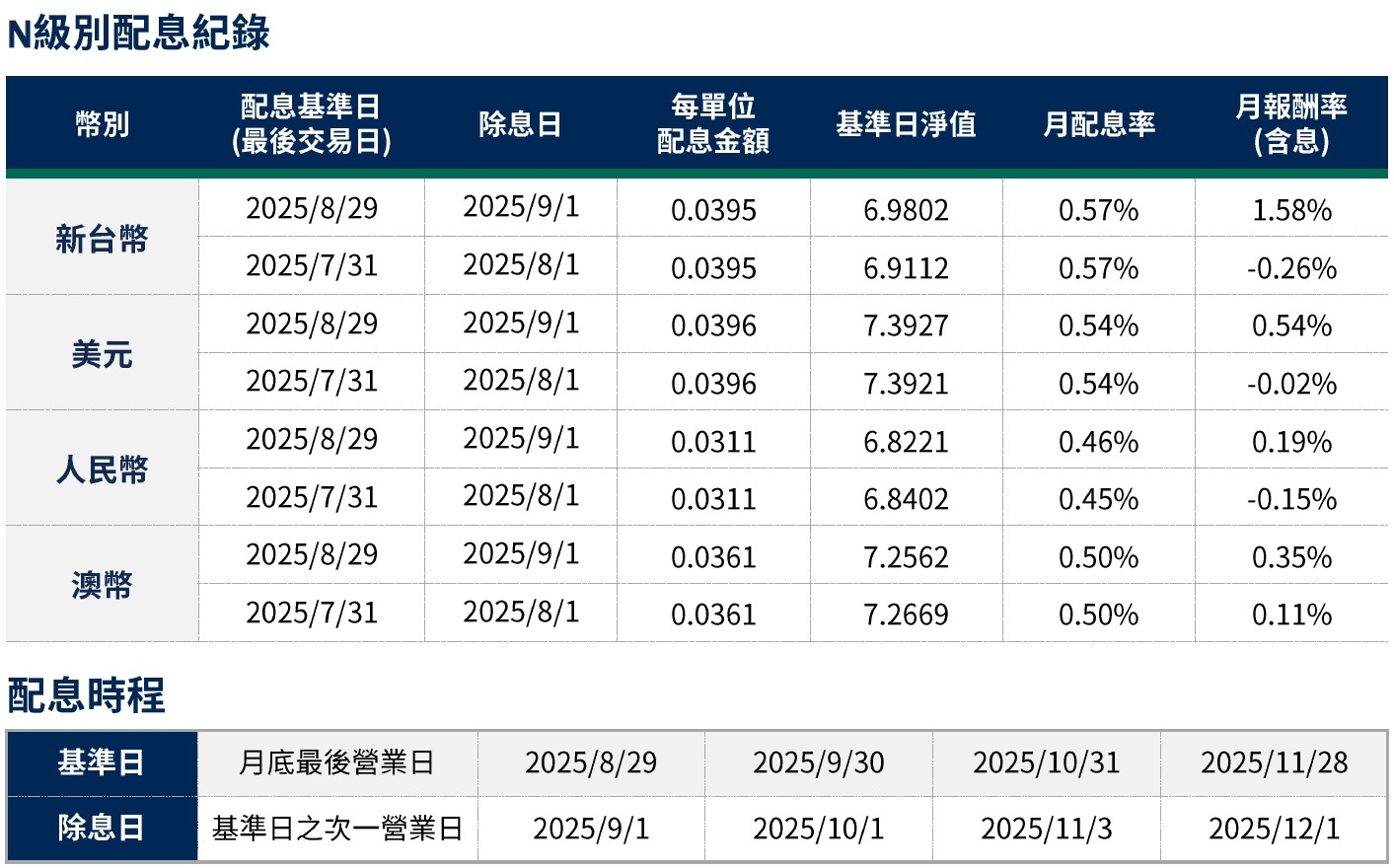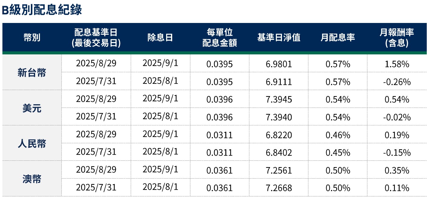 月配息率=(每單位配息金額÷除息日前一日淨值)×100%。月報酬率(含息)=(月底淨值-上月底淨值+上月配息金額)÷上月底淨值。舉凡成立第一個月配息者,該次「月報酬率」欄係指成立日至該月底之報酬率。資料來源:柏瑞投信,2025/9。新台幣/美元/人民幣/澳幣計價。基金配息不代表基金實際報酬,且過去配息不代表未來配息;基金淨值可能因市場因素而上下波動。積極配息的基金未必適合投資人,請投資前審慎評估。配息政策請詳閱各基金公開說明書;配息組成項目請至公司網站查詢。基金的配息可能由基金的收益或本金支付。任何涉及由本金支出的部分,可能導致原始投資金額減損。基金進行配息前未先扣除應負擔之相關費用。