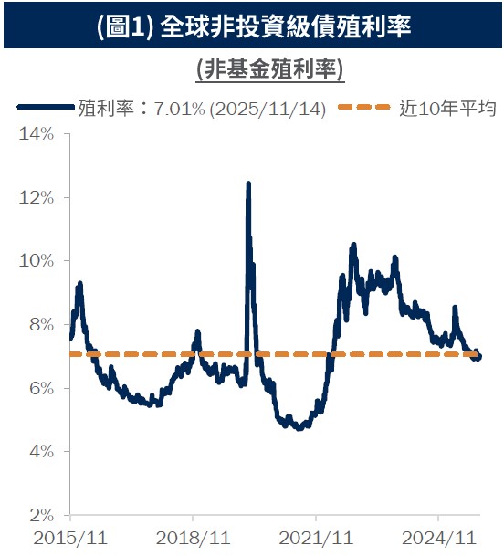 •近期非投資級債利差明顯收斂,目前全球非投資級債殖利率約7.01%,貼近於10年平均水準。(圖1)
