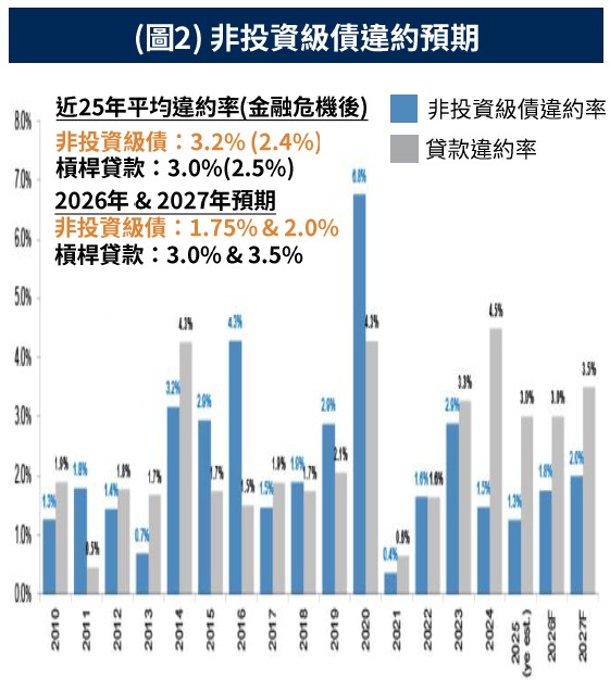 •受益於經濟環境仍具韌性與資本市場活動回溫,機構預期2026年非投資級債違約率將降至1.75% (圖2),將連續第三年低於金融危機後平均值2.4%。