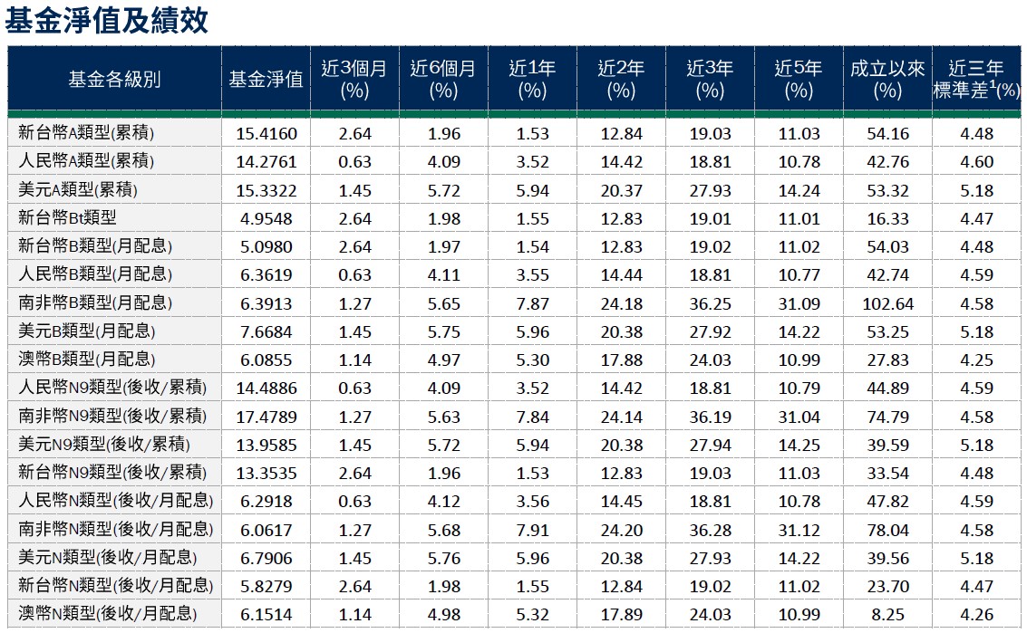 避險比率:新台幣避險比例為44.80%,人民幣級別避險比例 83.22%,澳幣級別避險比例85.83%,南非幣級別避險比例88.14%。