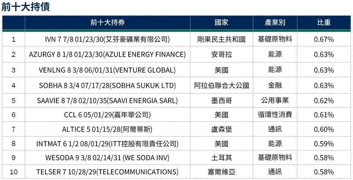 資料來源:柏瑞投信,2025/10/31。配置會隨市況而改變,本公司不另行通知。非投資等級債券仍有相關風險,請投資前審慎評估風險承受度。*平均殖利率係假設基金投資組合中各債券持有至到期所獲得的收益,包括各期利息收入的再投資。相當於按當前(計算日)市場價格購買並且一直持有到滿期時可獲得的年均報酬率。基金平均殖利率會隨著個別債券價格或票息等因素變動,不代表基金實質報酬率及未來走勢。本基金之投資組合平均信評計算方式:先依公開說明書定義,將標的分類為投資等級或非投資等級,在該分類下,若同一標的有多家信評公司給予不同信評時,按高低順序取最高信評。將個別債券按上述方式定義之信評等級,參酌其相對應之評分(例如:AAA為1分、AA+為2分,依此類推),並依標的市值佔淨資產價值之比重(包含現金),加權平均後無條件捨去,以此數值結果對應信評評分等級,及自投資組合確立後依投資標的信評揭示相關比重。