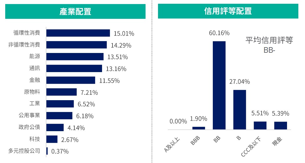 操作說明2:偏好循環性消費、非循環性消費、能源產業;存續期間維持中性,目前3.29年;信用評等聚焦BB與B評級資產,平均信評維持BB-。*(詳見下方註釋)