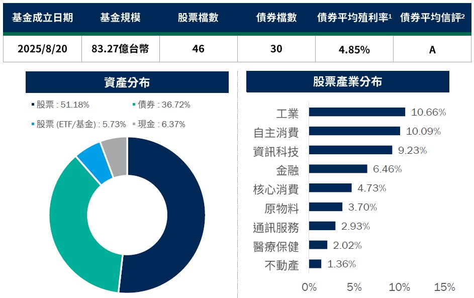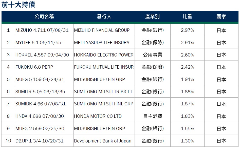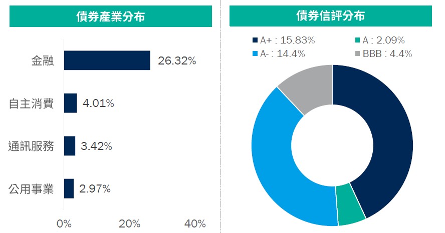 資料來源:柏瑞投信,2025/10/31。配置會隨市況而改變,本公司不另行通知。1. 平均殖利率係假設基金投資組合中各債券持有至到期所獲得的收益,包括各期利息收入的再投資。相當於按當前(計算日)市場價格購買並且一直持有到滿期時可獲得的年均報酬率。基金平均殖利率會隨著個別債券價格或票息等因素變動,不代表基金實質報酬率及未來走勢。2. 本基金之投資組合平均信評計算方式:若同一標的有多家信評公司給予不同信評時,按高低順序取最高信評。將個別債券按上述方式定義之信評等級,參酌其相對應之評分(例如:AAA為1分、AA+為2分,依此類推),並依標的市值佔淨資產價值之比重(包含現金),加權平均後無條件捨去,以此數值結果對應信評評分等級,及自投資組合確立後依投資標的信評揭示相關比重。投資人申購本基金係持有基金受益憑證,而非本文提及之投資資產或標的。