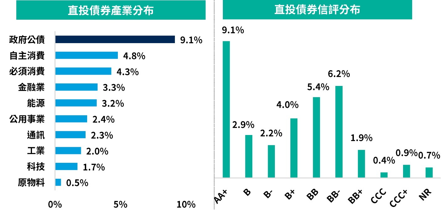 資料來源:柏瑞投信,2025/11/25。配置會隨市況而改變,本公司不另行通知。非投資等級債券仍有相關風險,請投資前審慎評估風險承受度。*平均殖利率係假設基金投資組合中各債券持有至到期所獲得的收益,包括各期利息收入的再投資。相當於按當前(計算日)市場價格購買並且一直持有到滿期時可獲得的年均報酬率。1.基金平均殖利率會隨著個別債券價格或票息等因素變動,不代表基金實質報酬率及未來走勢。2.本基金之投資組合平均信評計算方式:若同一標的有多家信評公司給予不同信評時,按高低順序取最高信評。將個別債券按上述方式定義之信評等級,參酌其相對應之評分(例如:AAA為1分、AA+為2分,依此類推),並依標的市值佔債券部位淨資產價值之比重(包含現金),加權平均後無條件捨去,以此數值結果對應信評評分等級,及自投資組合確立後依投資標的信評揭示相關比重。投資人申購本基金係持有基金受益憑證,而非本文提及之投資資產或標的。投資人應留意衍生性工具/證券相關商品等槓桿投資策略所可能產生之投資風險,詳見公開說明書。