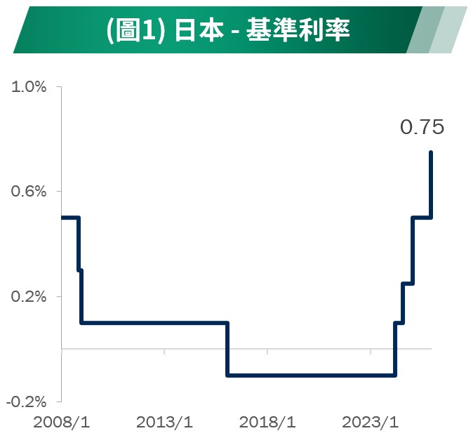 •日本央行升息1碼:日本央行於12月決議如市場預期,將政策利率自0.5%調升至0.75% (圖1),創下近30年新高。央行總裁植田和男表示,目前距離中性利率區間仍有一段空間,未來寬鬆政策的調整將視經濟表現與通膨數據而定。此外,央行將持續關注長期公債殖利率變化,必要時將透過彈性購債操作以穩定利率。