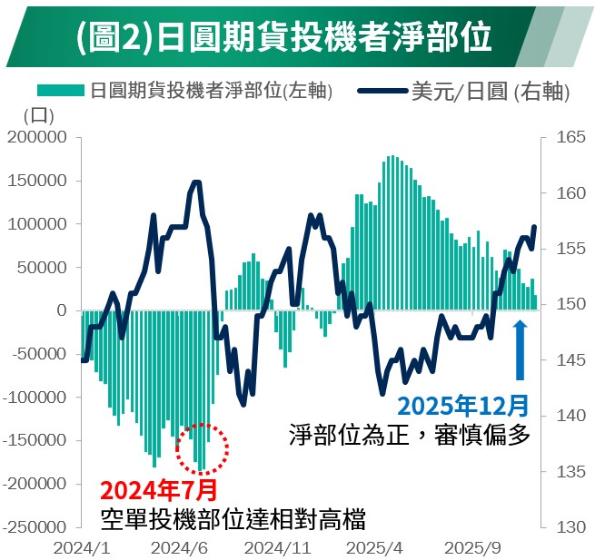 •日圓套利平倉風險:隨著日本往利率正常化推進,市場對2024年日圓套利交易平倉的擔憂再度升溫,但本次升息所處的背景與前次明顯不同。2024年市場未反應升息預期,不過本次12月升息已於約兩週前被市場提前反映,且目前日圓期貨淨部位已轉為正值 (圖2),不同於去年有大量「空頭」部位。因此,上週五宣布升息後,市場反應相對溫和,東證指數當日(12/19)上漲0.8%;美元兌日圓收於157.75。
