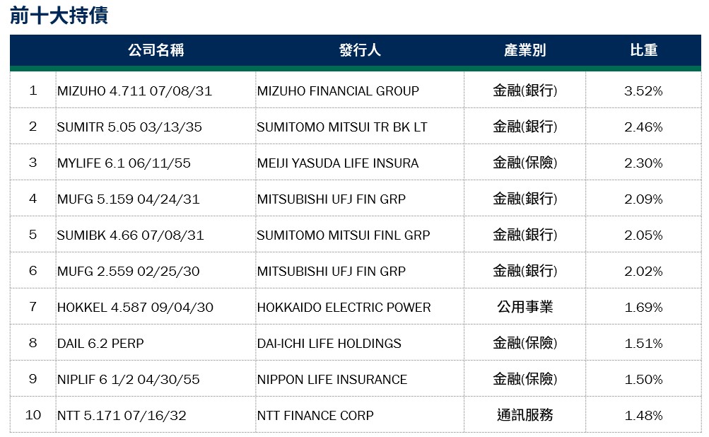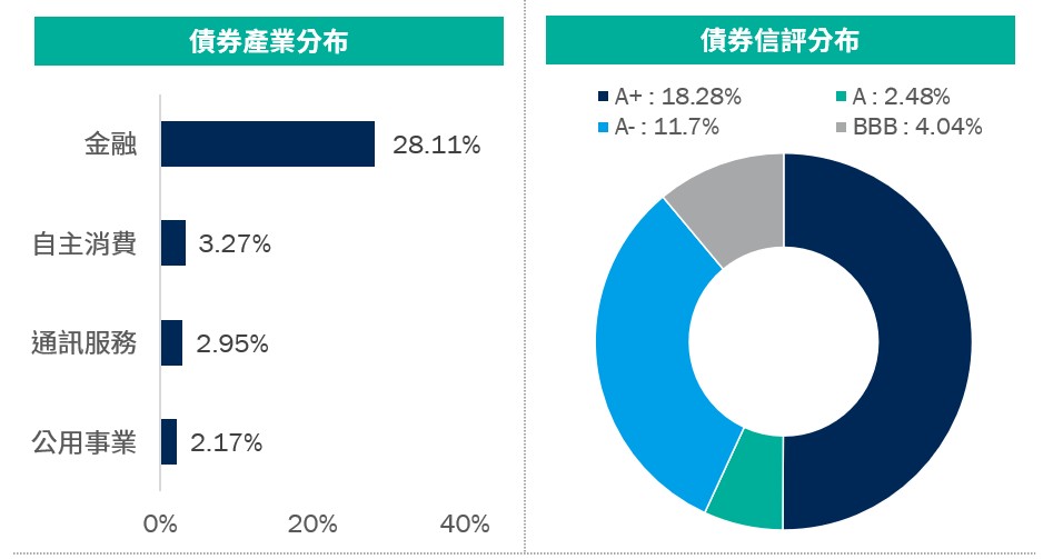 資料來源:柏瑞投信,2025/11/30。配置會隨市況而改變,本公司不另行通知。1. 平均殖利率係假設基金投資組合中各債券持有至到期所獲得的收益,包括各期利息收入的再投資。相當於按當前(計算日)市場價格購買並且一直持有到滿期時可獲得的年均報酬率。基金平均殖利率會隨著個別債券價格或票息等因素變動,不代表基金實質報酬率及未來走勢。2. 本基金之投資組合平均信評計算方式:若同一標的有多家信評公司給予不同信評時,按高低順序取最高信評。將個別債券按上述方式定義之信評等級,參酌其相對應之評分(例如:AAA為1分、AA+為2分,依此類推),並依標的市值佔淨資產價值之比重(包含現金),加權平均後無條件捨去,以此數值結果對應信評評分等級,及自投資組合確立後依投資標的信評揭示相關比重。投資人申購本基金係持有基金受益憑證,而非本文提及之投資資產或標的。