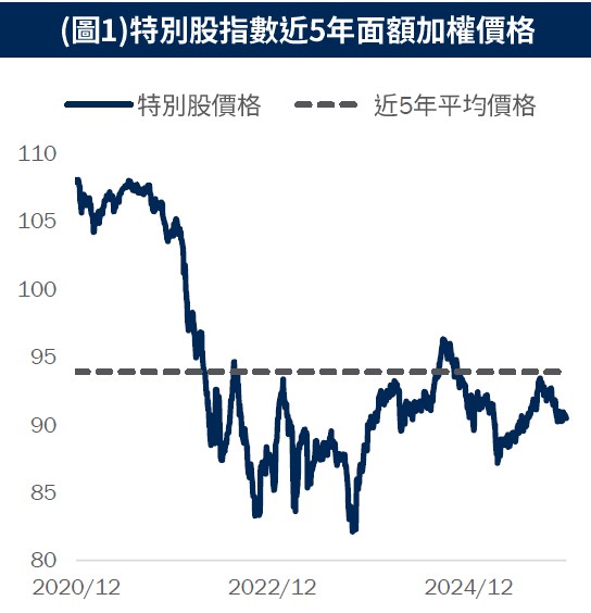 特別股指數表現:近兩週美國10年期公債殖利率下降至4.16%,特別股指數上漲0.41%;面額價格相比5年均值相對折價(圖1)。