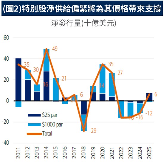 特別股淨供給偏緊將為其價格帶來支撐:隨著銀行資本水準維持高檔,展望2026年企業再發行特別股的動機不高,加上銀行以外的企業融資持續轉向混合型債券,特別股有限的供給(圖2)預期將為其價格帶來支撐。