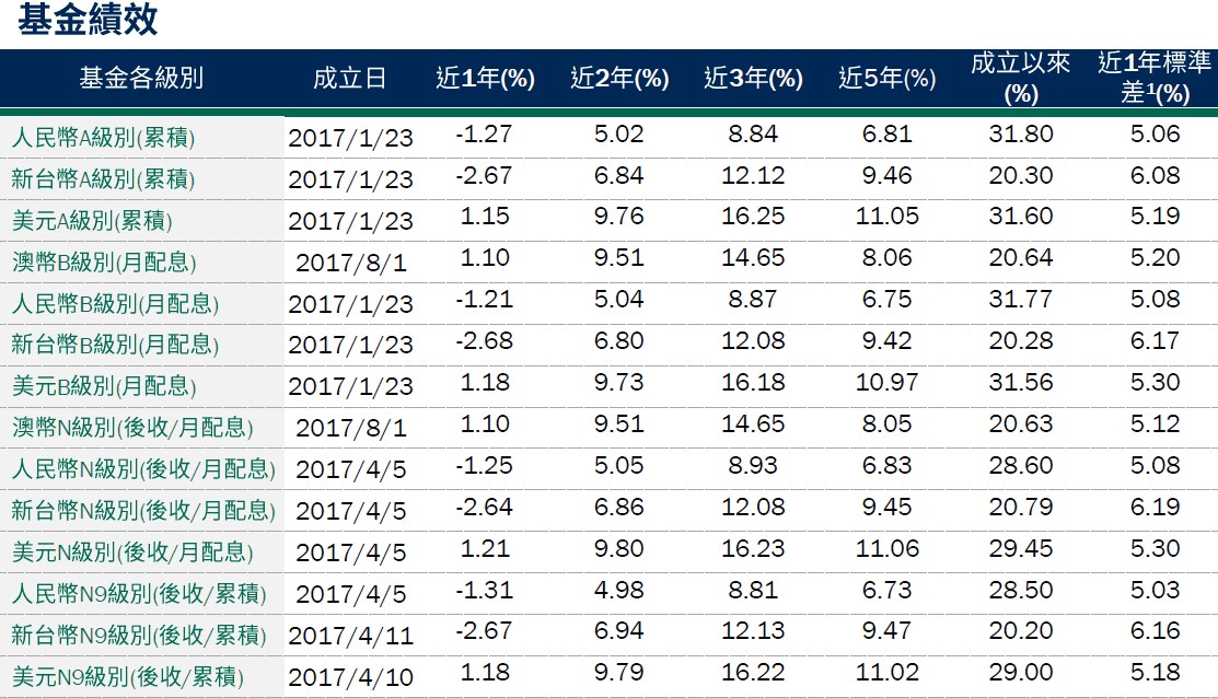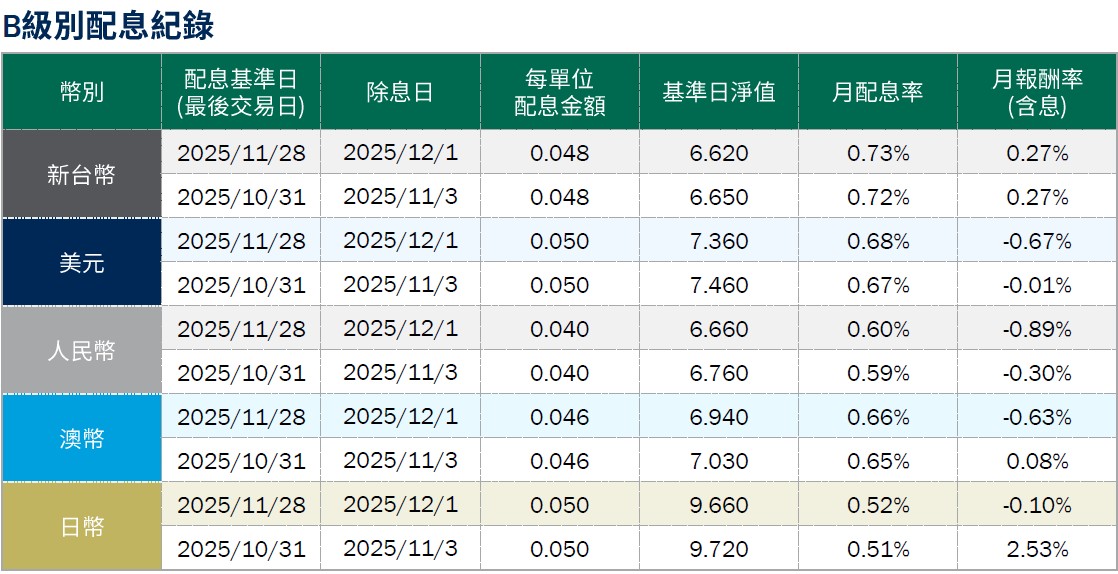 月配息率=(每單位配息金額÷除息日前一日淨值)×100%。 月報酬率(含息)=(月底淨值-上月底淨值+上月配息金額)÷上月底淨值。資料來源:柏瑞投信,2025/12。新台幣/美元/人民幣/澳幣/日幣計價。所列日期僅供參考,詳細以相關公告資訊為主,如有更改以基金公司最新公佈為準。基金配息不代表基金實際報酬,且過去配息不代表未來配息;基金淨值可能因市場因素而上下波動。積極配息的基金未必適合投資人,請投資前審慎評估。配息政策請詳閱各基金公開說明書;配息組成項目請至公司網站查詢。基金的配息可能由基金的收益或本金支付。任何涉及由本金支出的部分,可能導致原始投資金額減損。基金進行配息前未先扣除應負擔之相關費用。