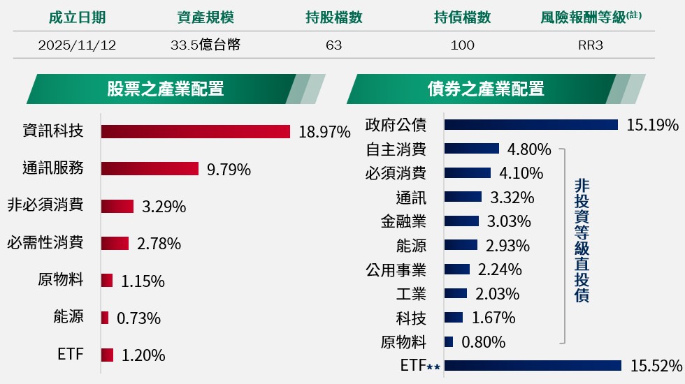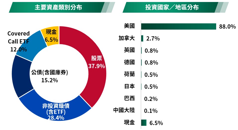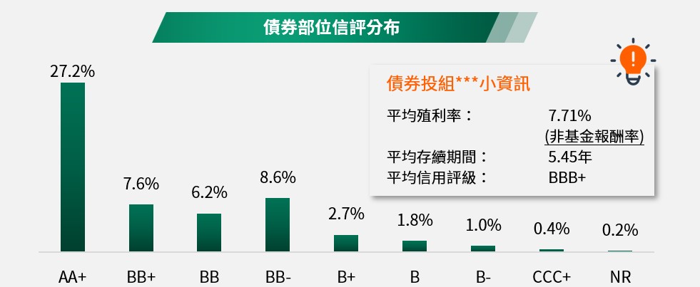 (註):本基金為多重資產型基金,投資區域以美國為主,透過多重資產配置策略,聚焦NASDAQ掛牌之股票以及搭配「非投資等級債券+政府公債」組成的債券槓鈴策略,同步分散風險,尋求參與美股創新成長契機及債券收益機會,並彈性將掩護性買權策略運用於股票、債券曝險部位增進收益來源,惟風險無法因分散投資而完全消除,遇相關風險時對基金淨資產價值可能產生較大波動,經回測過去5年本基金策略模擬年化波動度,並與同類型基金過去5年淨值波動度及內部波動度參考指數之過去5年波動度相較,爰參酌投信投顧公會「基金風險報酬等級分類標準」,本基金風險報酬等級為RR3*。*風險報酬等級為本公司依照投信投顧公會「基金風險報酬等級分類標準」編製,該分類標準係計算過去5年基金淨值波動度標準差,以標準差區間予以分類等級,分類為RR1-RR5五級,數字越大代表風險越高。此等級分類係基於一般市場狀況反映市場價格波動風險,無法涵蓋所有風險(如:基金計價幣別匯率風險、投資標的產業風險、信用風險、利率風險、流動性風險等),不宜作為投資唯一依據,投資人仍應注意所投資基金個別的風險。請投資人注意申購基金前應詳閱公開說明書,充分評估基金投資特性與風險,更多基金評估之相關資料(如年化標準差、Alpha、Beta及Sharpe值等)可至投信投顧公會網站之「基金績效及評估指標查詢專區」(https://www.sitca.org.tw/index_pc.aspx )查詢。 資料來源:柏瑞投信,2026/1/22。平均殖利率及債券平均存續期間計算不含現金;平均殖利率係假設基金投資組合中各債券持有至到期所獲得的收益,包括各期利息收入的再投資,相當於按當前(計算日)市場價格購買並且一直持有到滿期時可獲得的年均報酬率;基金平均殖利率會隨著個別債券價格或票息等因素變動,不代表基金實質報酬率及未來走勢。債券平均信用評級計算不含國庫券、現金;債券平均信評計算方式:若同一標的有多家信評公司給予不同信評時,按高低順序取最高信評。將個別債券按上述方式定義之信評等級,參酌其相對應之評分(例如:AAA為1分、AA+為2分,依此類推),並依標的市值佔債券部位淨資產價值之比重(包含現金),加權平均後無條件捨去,以此數值結果對應信評評分等級,及自投資組合確立後依投資標的信評揭示相關比重。**ETF配置含Covered call ETF、非投資等級債券ETF。***債券投組資訊計算含Covered call ETF、非投資等級債券ETF,ETF信評取自ETF發行公司公布之信評。投資人應留意衍生性工具 /證券相關商品等槓桿投資策略所可能產生之投資風險(詳見公開說明書)。非投資等級債仍有相關風險。投資人申購本基金係持有基金受益憑證,而非本文提及之投資資產或標的。配置會隨市況而改變,本公司不另行通知。