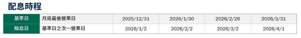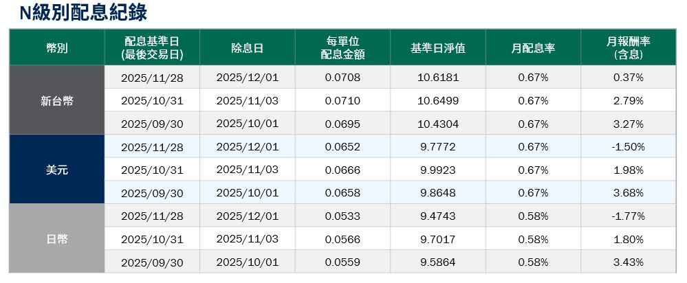 月配息率=(每單位配息金額÷除息日前一日淨值)×100%。 月報酬率(含息)=(月底淨值-上月底淨值+上月配息金額)÷上月底淨值。資料來源:柏瑞投信,2025/12。新台幣/美元/日幣計價。 基金配息不代表基金實際報酬,且過去配息不代表未來配息;基金淨值可能因市場因素而上下波動。積極配息的基金未必適合投資人,請投資前審慎評估。配息政策請詳閱各基金公開說明書;配息組成項目請至公司網站查詢。基金的配息可能由基金的收益或本金中支付。任何涉及由本金支出的部份,可能導致原始投資金額減損。基金進行配息前未先扣除應負擔之相關費用。