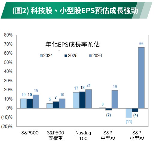 •股市未來展望:市場預期今年企業獲利動能呈現「由大到小」的擴散趨勢。大型指數如 S&P500與Nasdaq100維持雙位數EPS成長,反映AI與科技龍頭的基本面支撐;而中小型股獲利成長預估大幅跳升,顯示在景氣軟著陸與資金環境改善下,股市輪動有望擴散至中小型股,為後續行情提供更廣泛的上行空間。