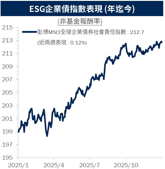資料來源:Bloomberg,2025/1/27至2026/1/27,採用彭博MSCI全球企業債券社會責任指數。圖文與所提及之有價證券僅供參考,此策略不代表絕無風險,本公司未藉此做任何徵求、推薦及獲利之保證。投資人申購本基金係持有基金受益憑證,而非本文提及之投資資產或標的。非基金績效參考指標。 過去績效不代表未來收益之保證。